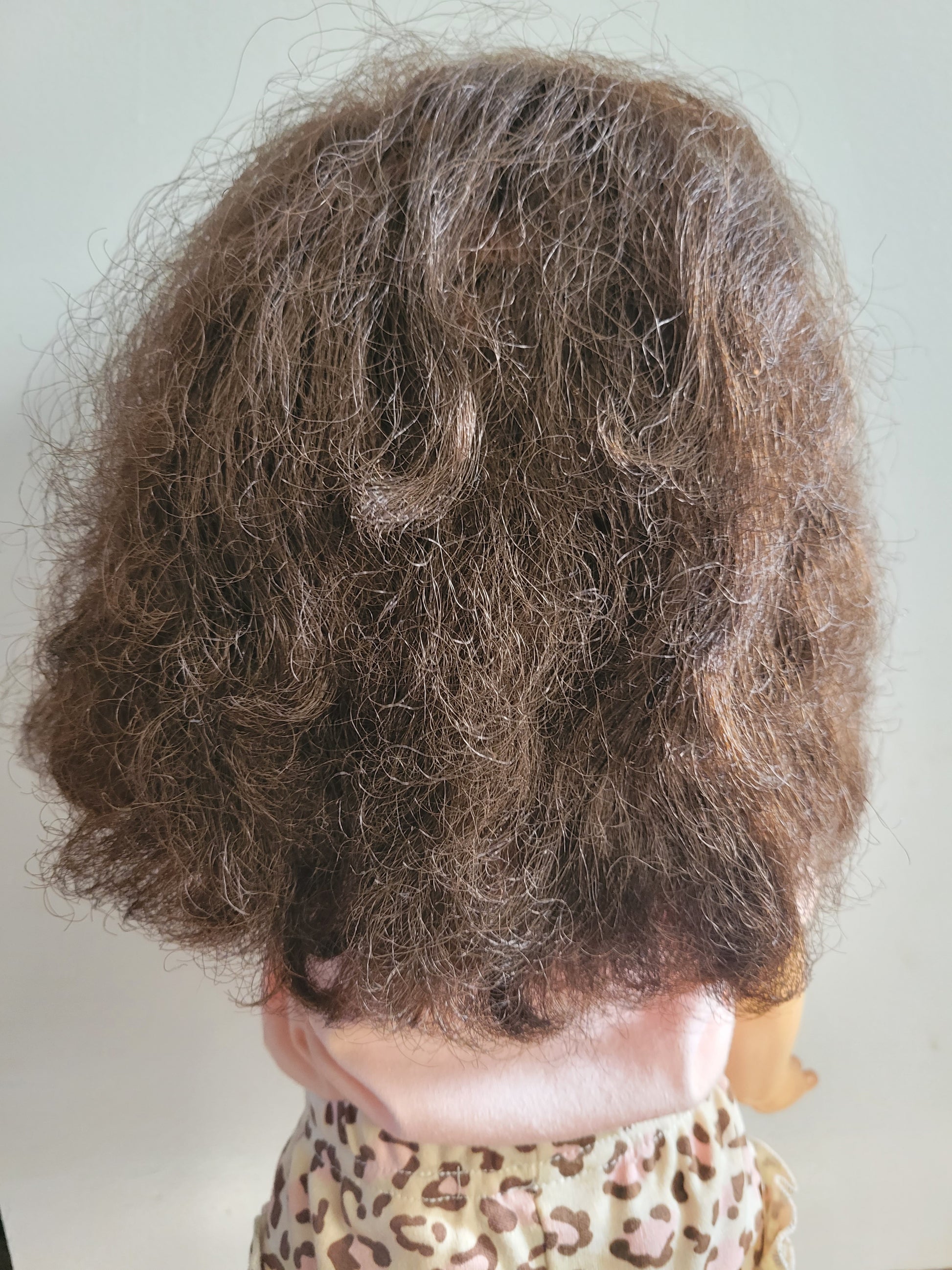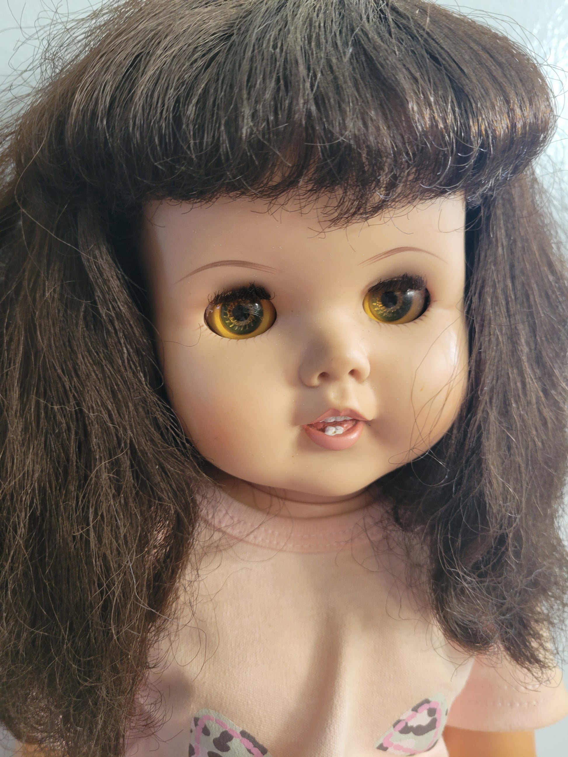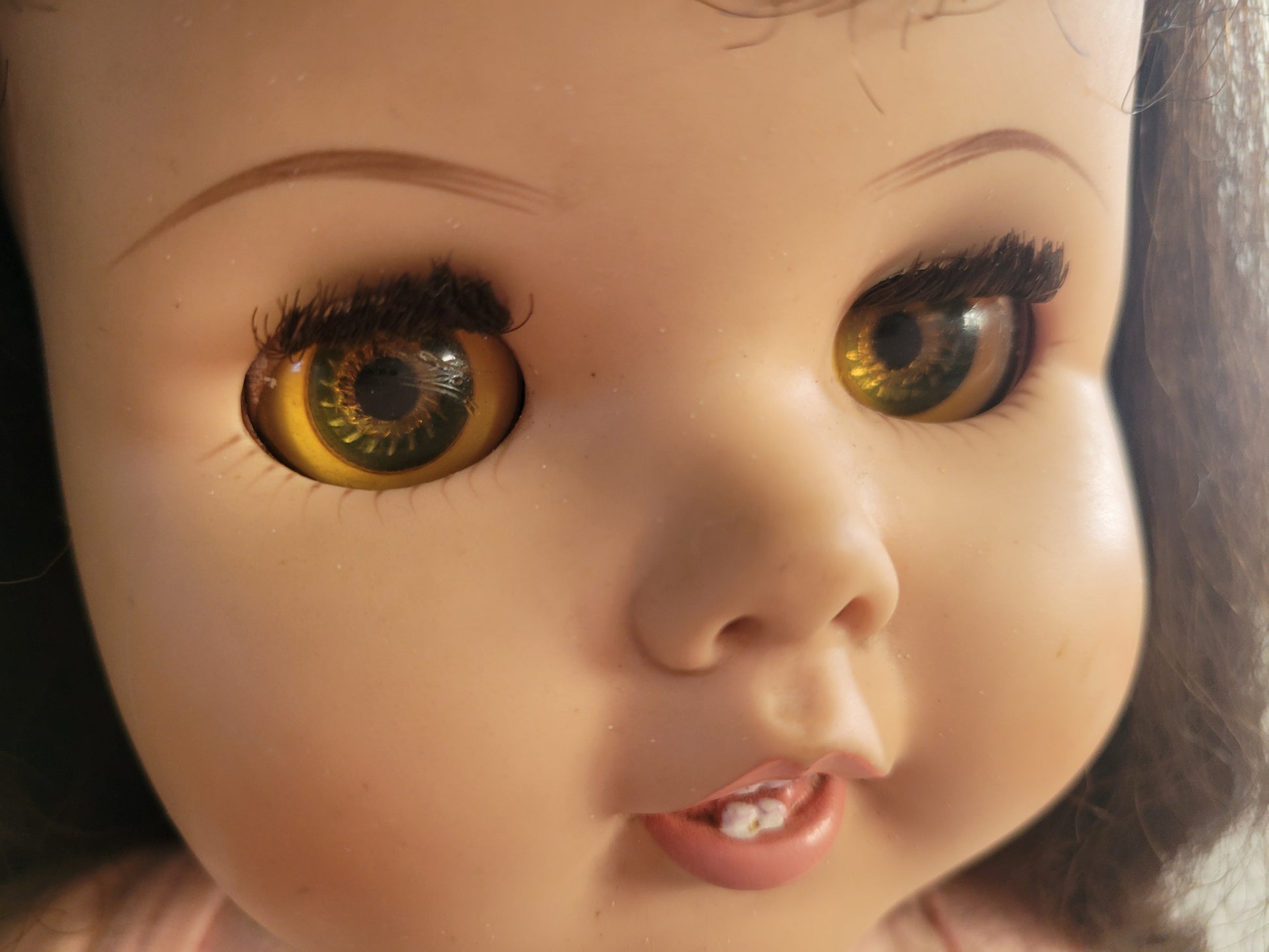 This vintage Toodles doll by American Character is a 24-inch brunette haired girl doll with wavy, long hair and green eyes that open and close. Her eyes do look to have some yellowing or color changing from age.