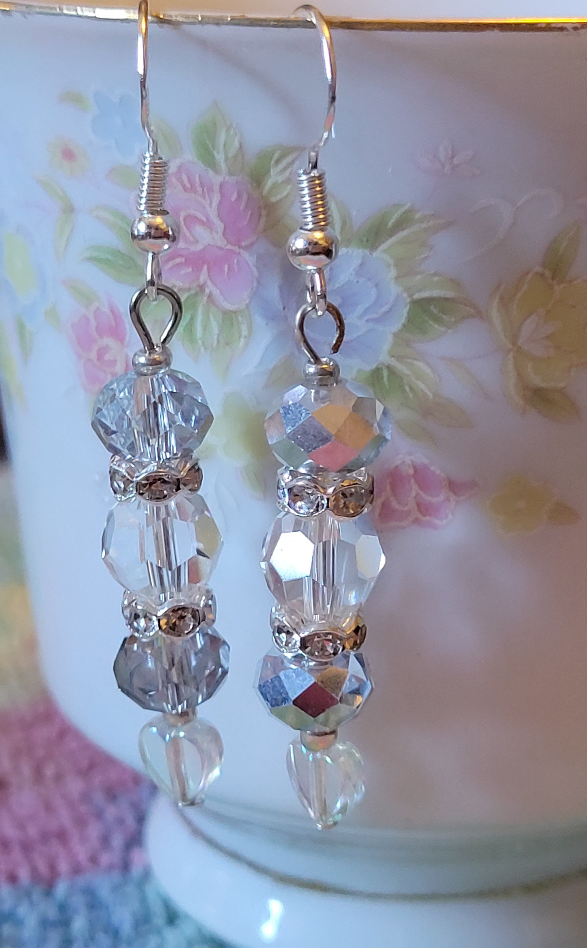 Elegant Light Gray & Clear Crystal bead Dangle Pierced earrings