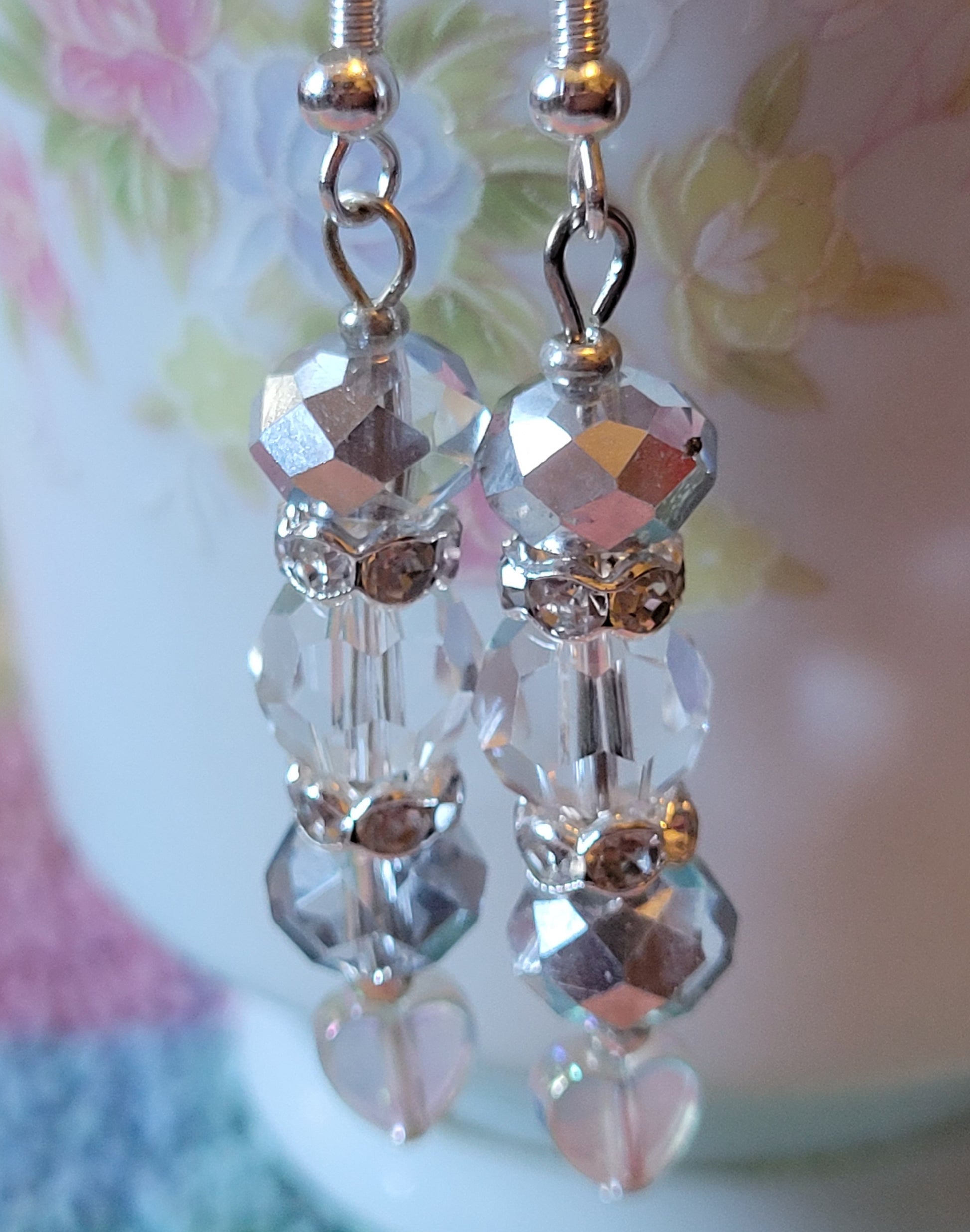 Artisan Elegant Light Gray HEART Crystal Rhinestone Dangle Silver Earrings