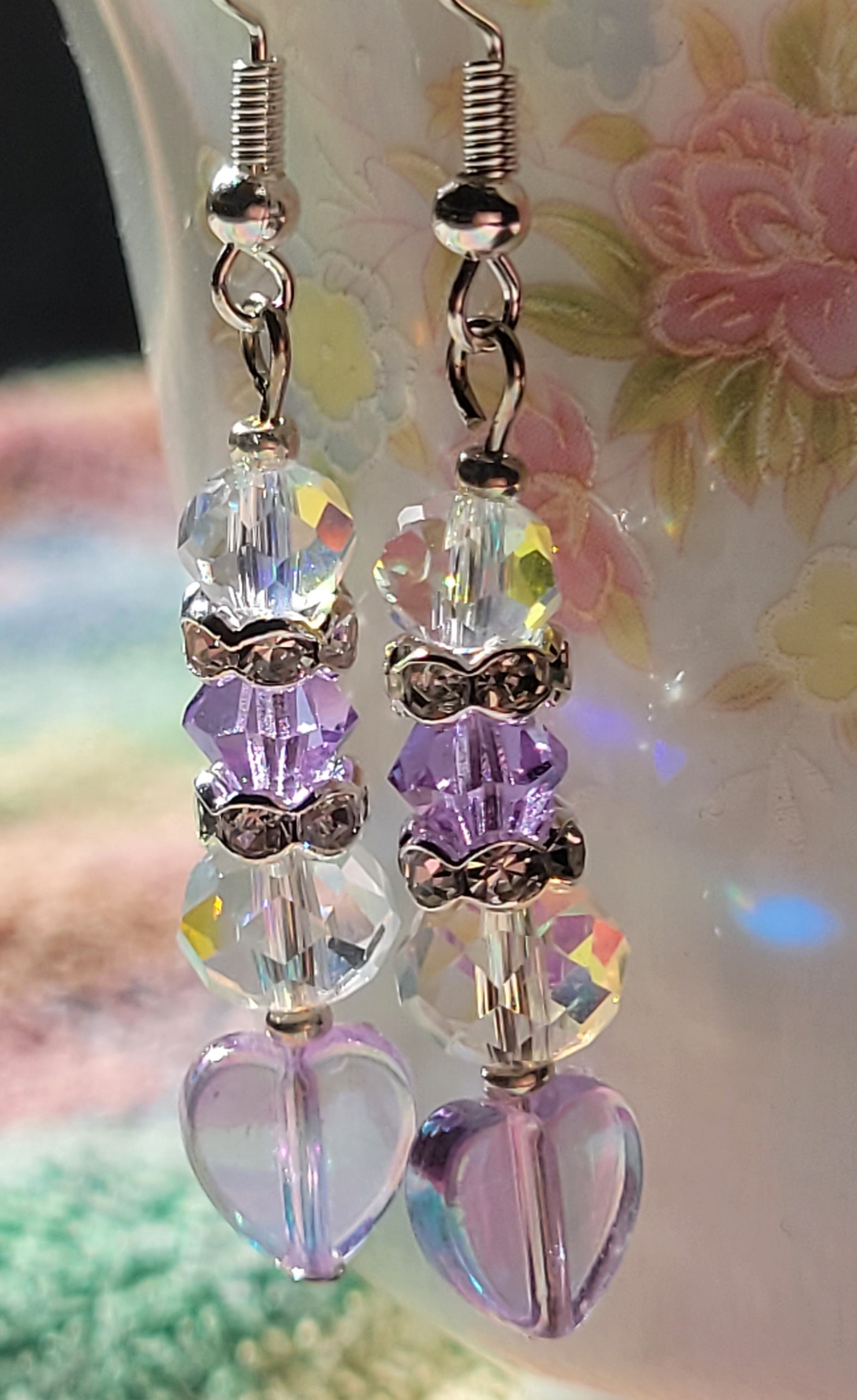 Elegant PURPLE Crystal BEADS and Hearts Dangle earrings
