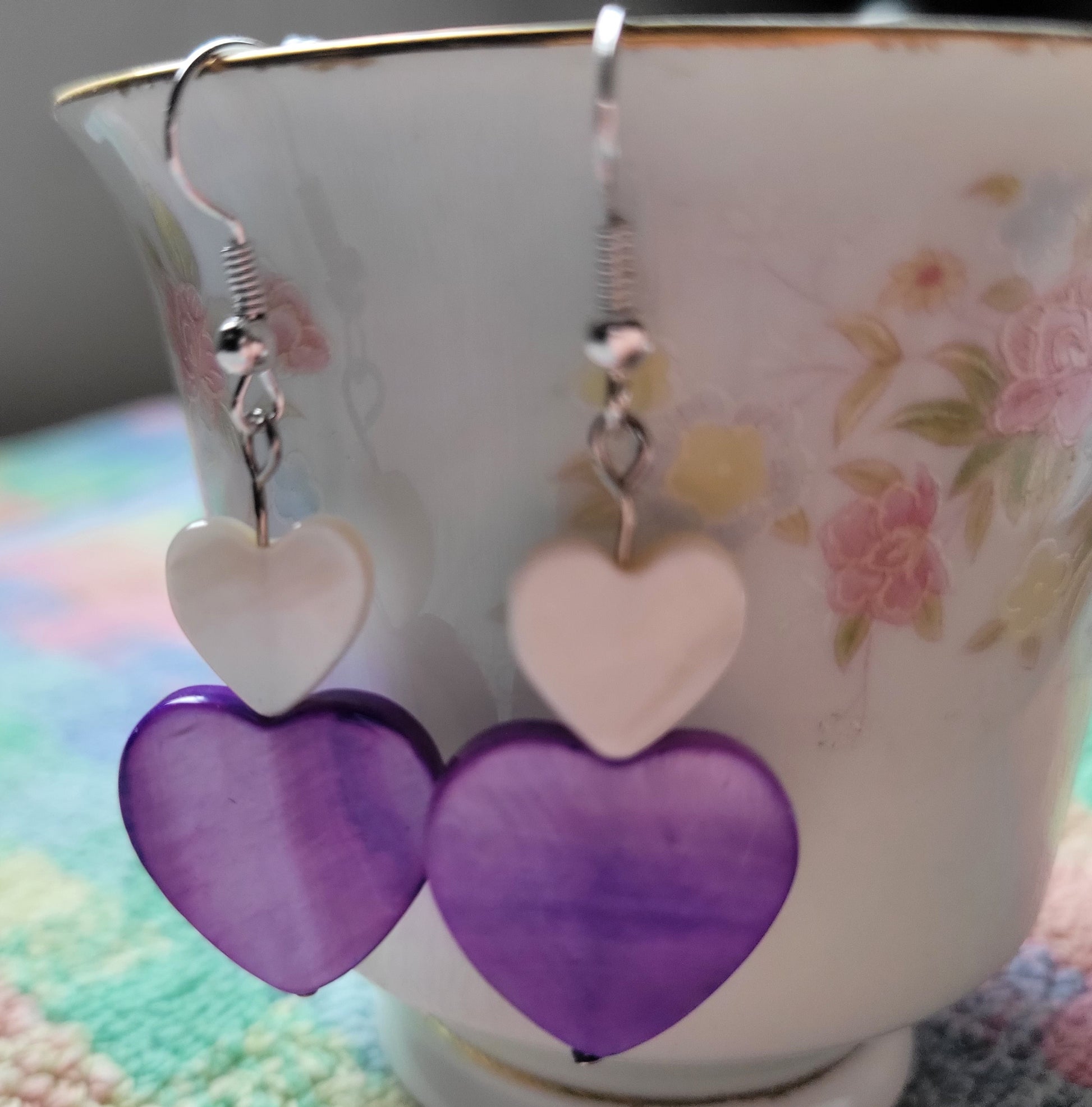 Artisan Purple And White HEART Dangle Drop Earrings OOAK 💜