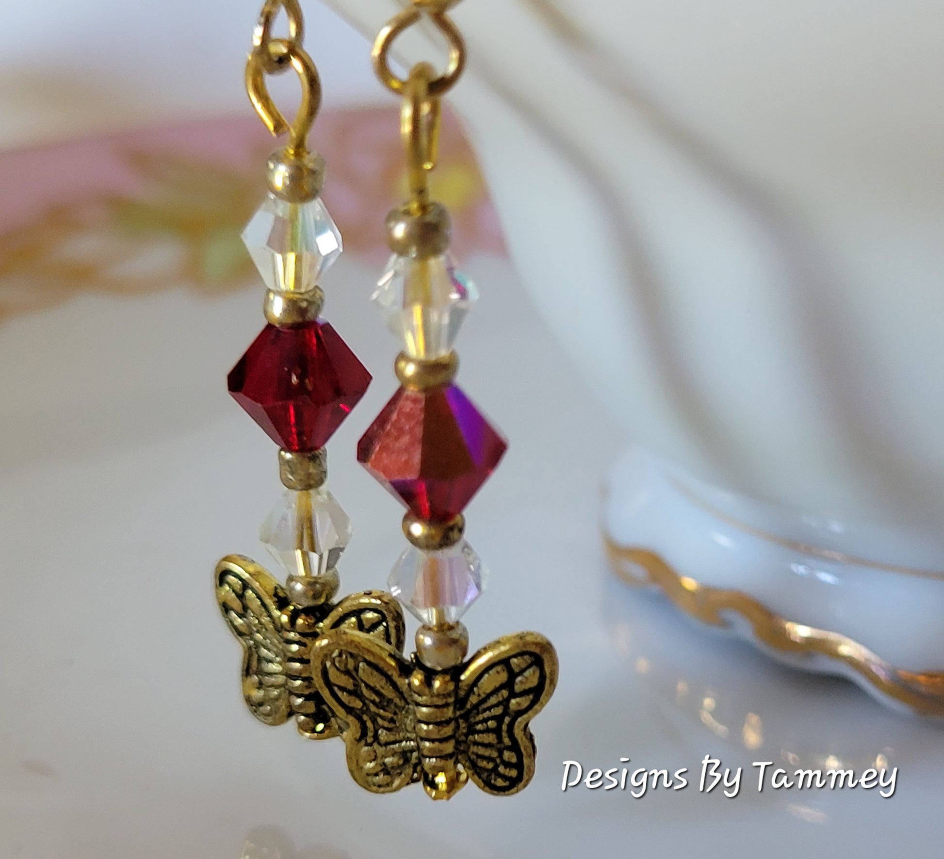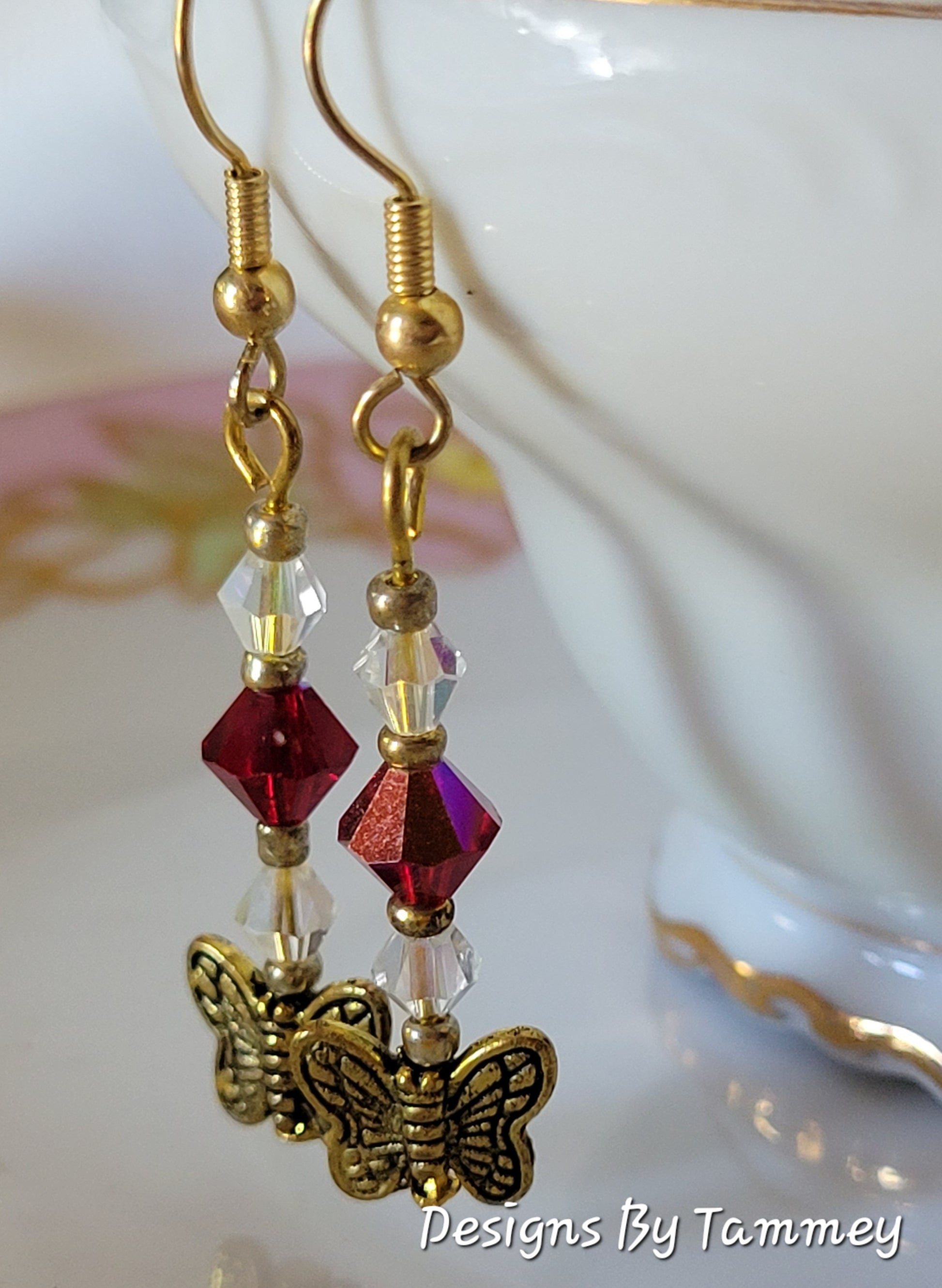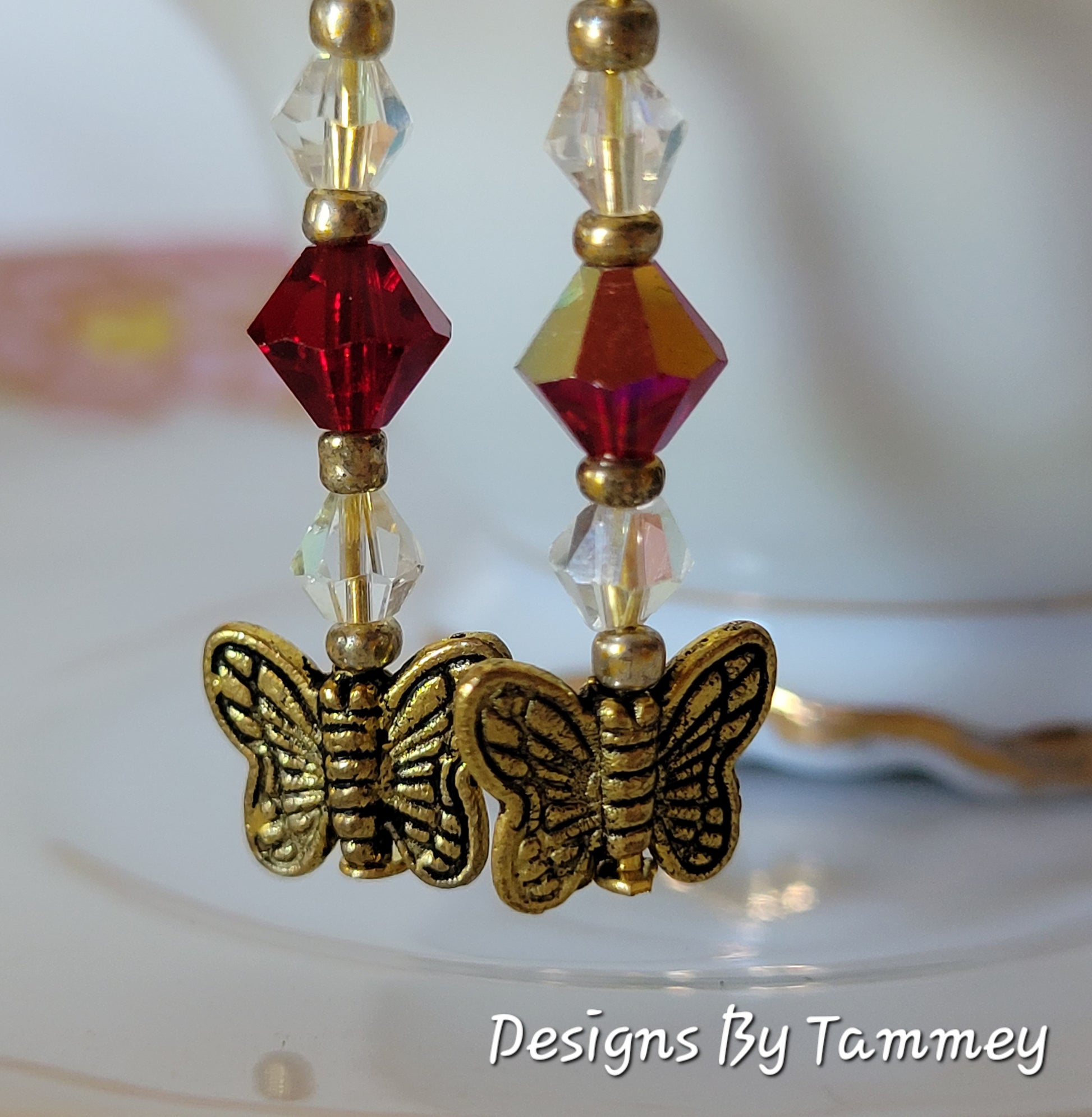 BUTTERFLY Red Crystal Dangle Fashion Earrings Handmade OOAK