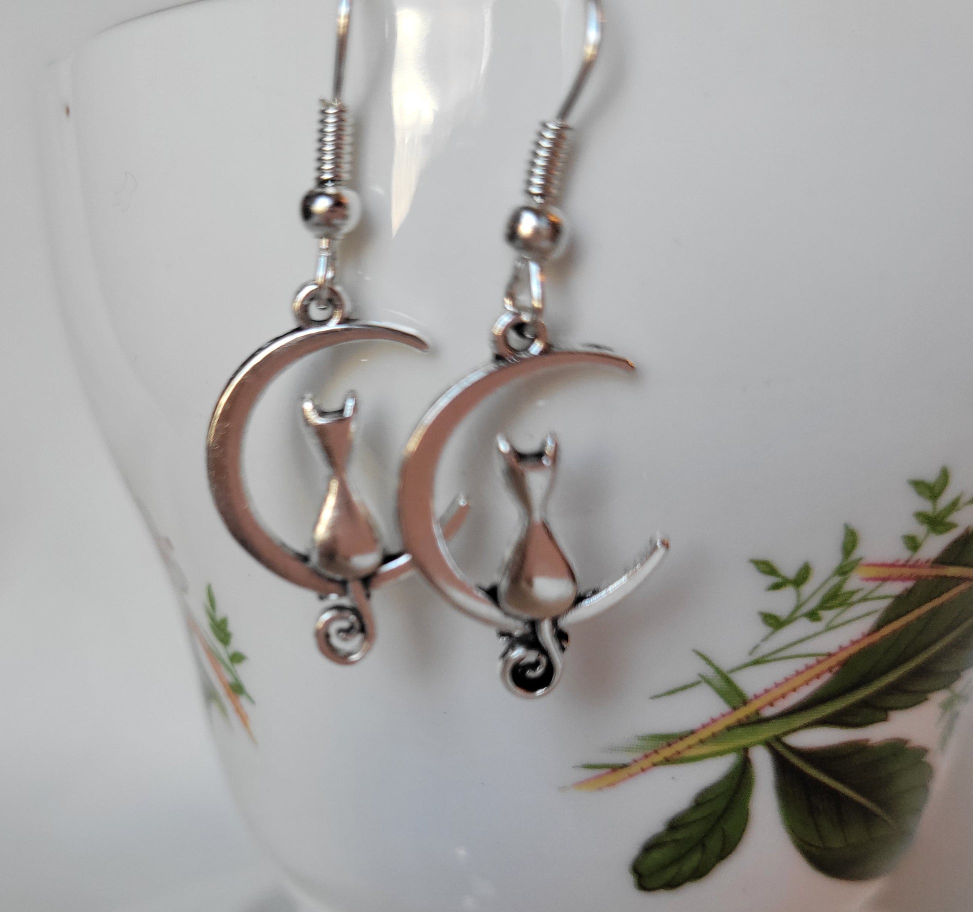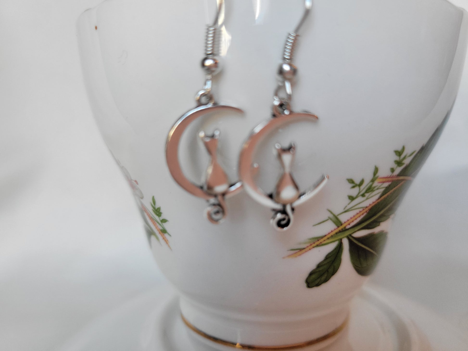 CAT & CRESCENT MOON Dangle Drop Earrings