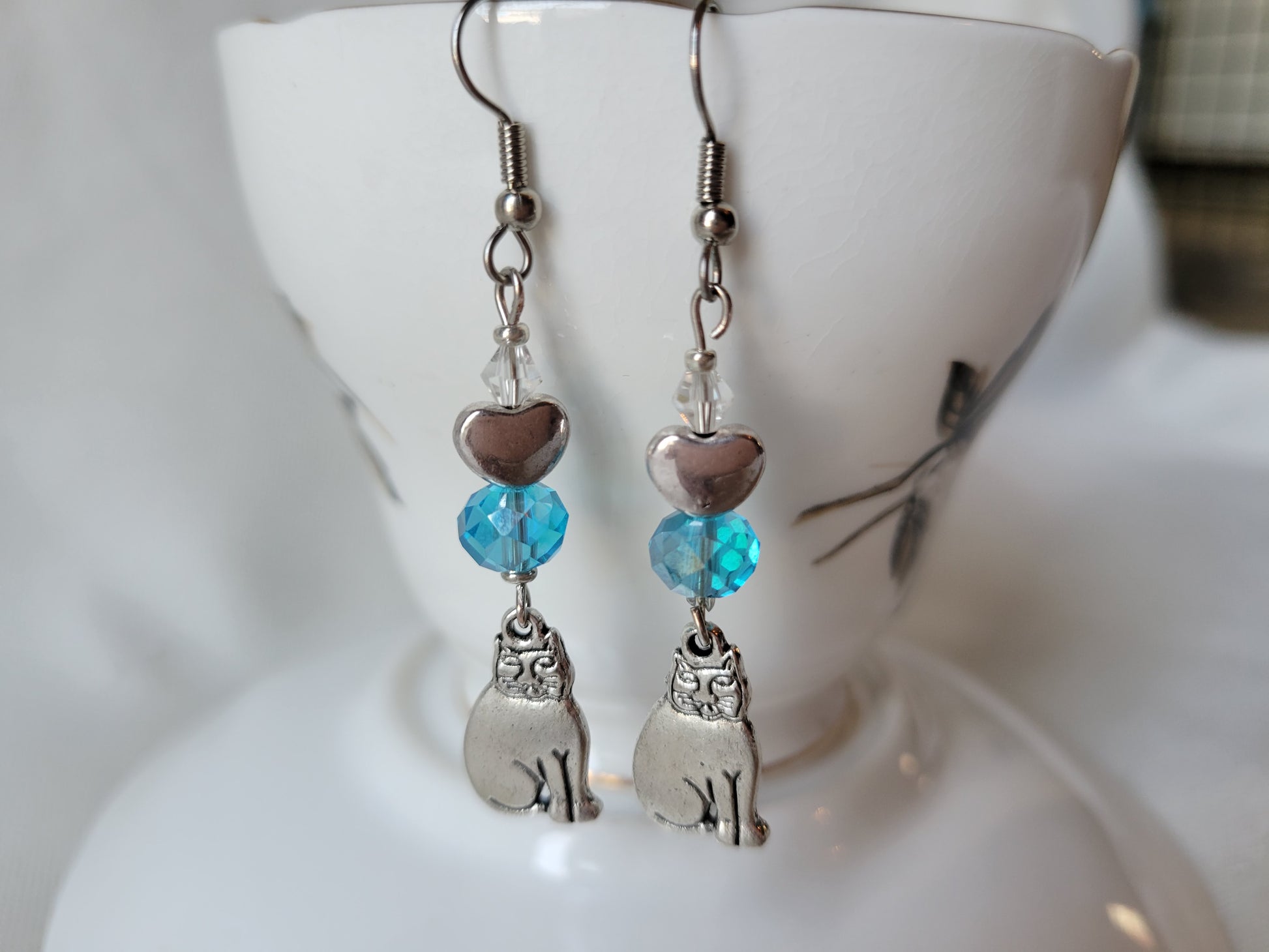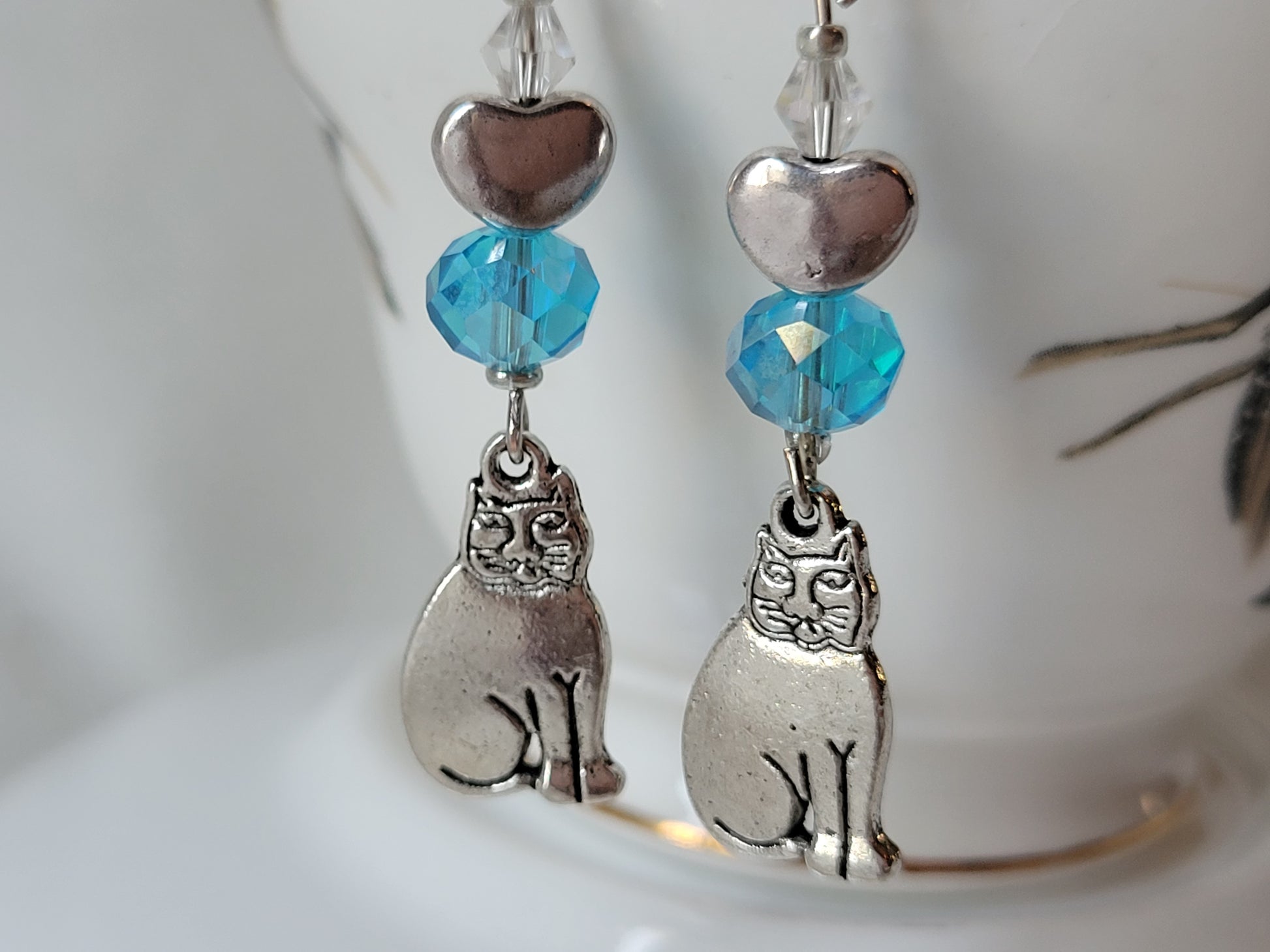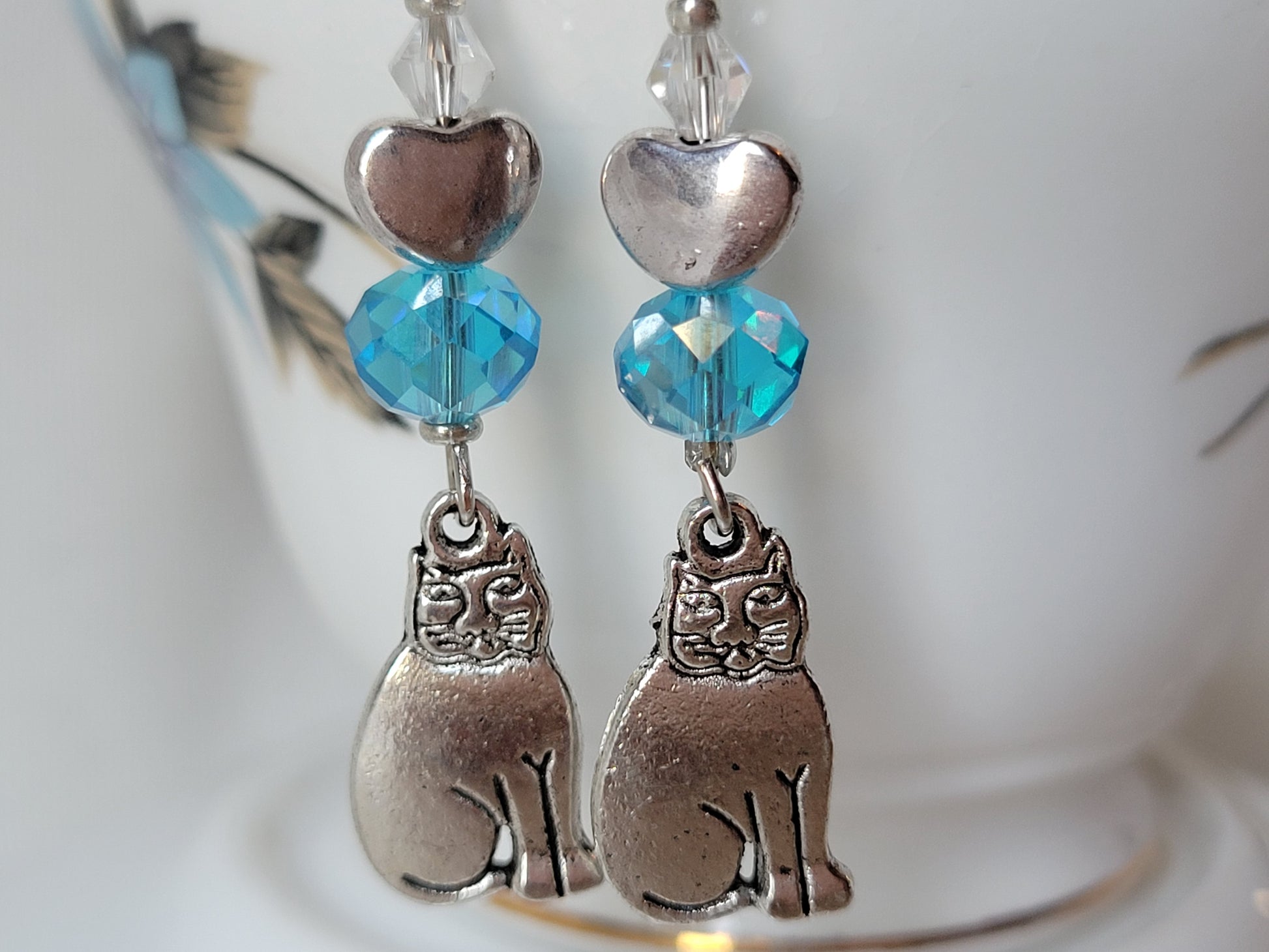 Cat Earrings Love MyTabby Cat Kitten Turquoise Blue Crystal Dangle Drop Earrings