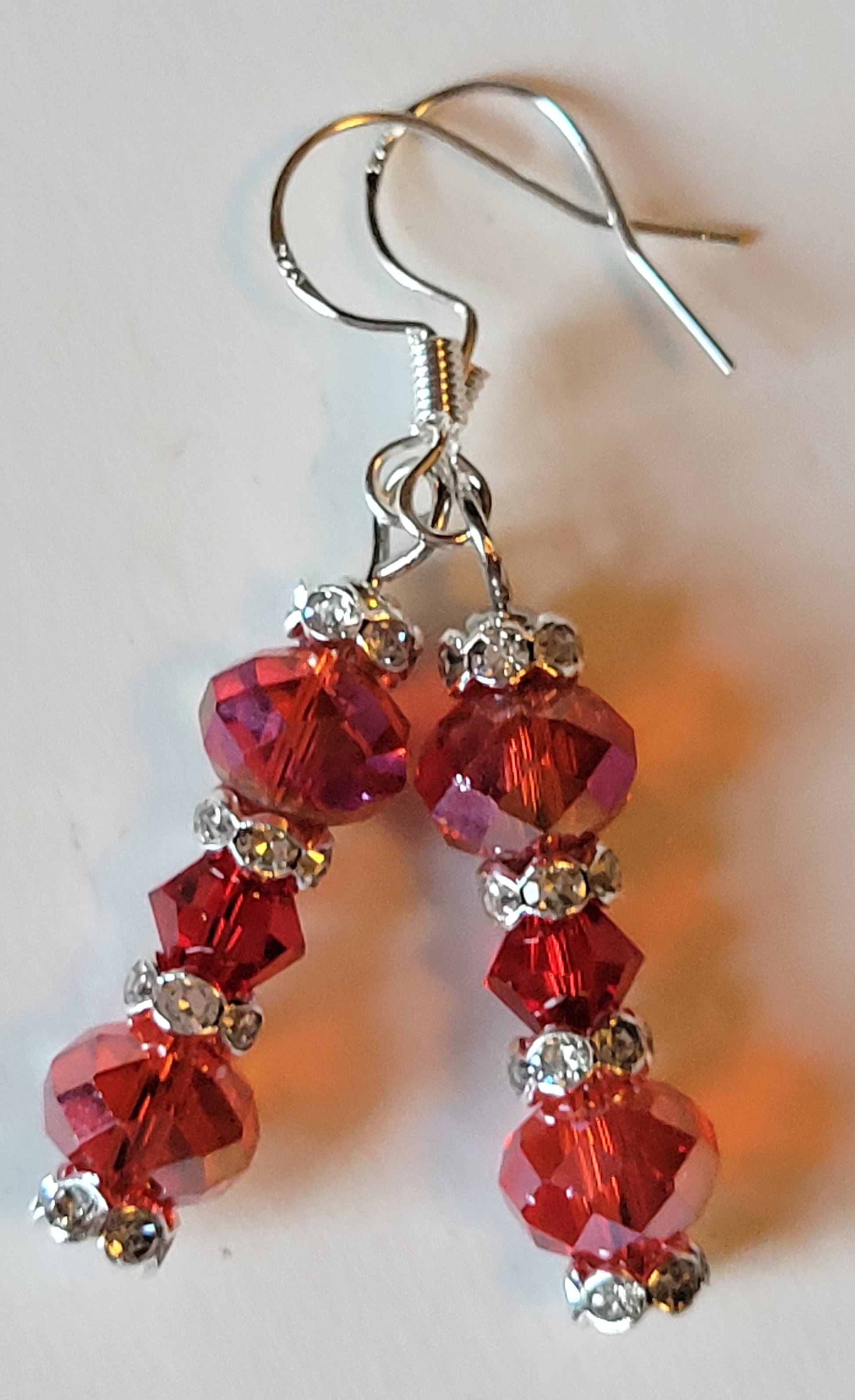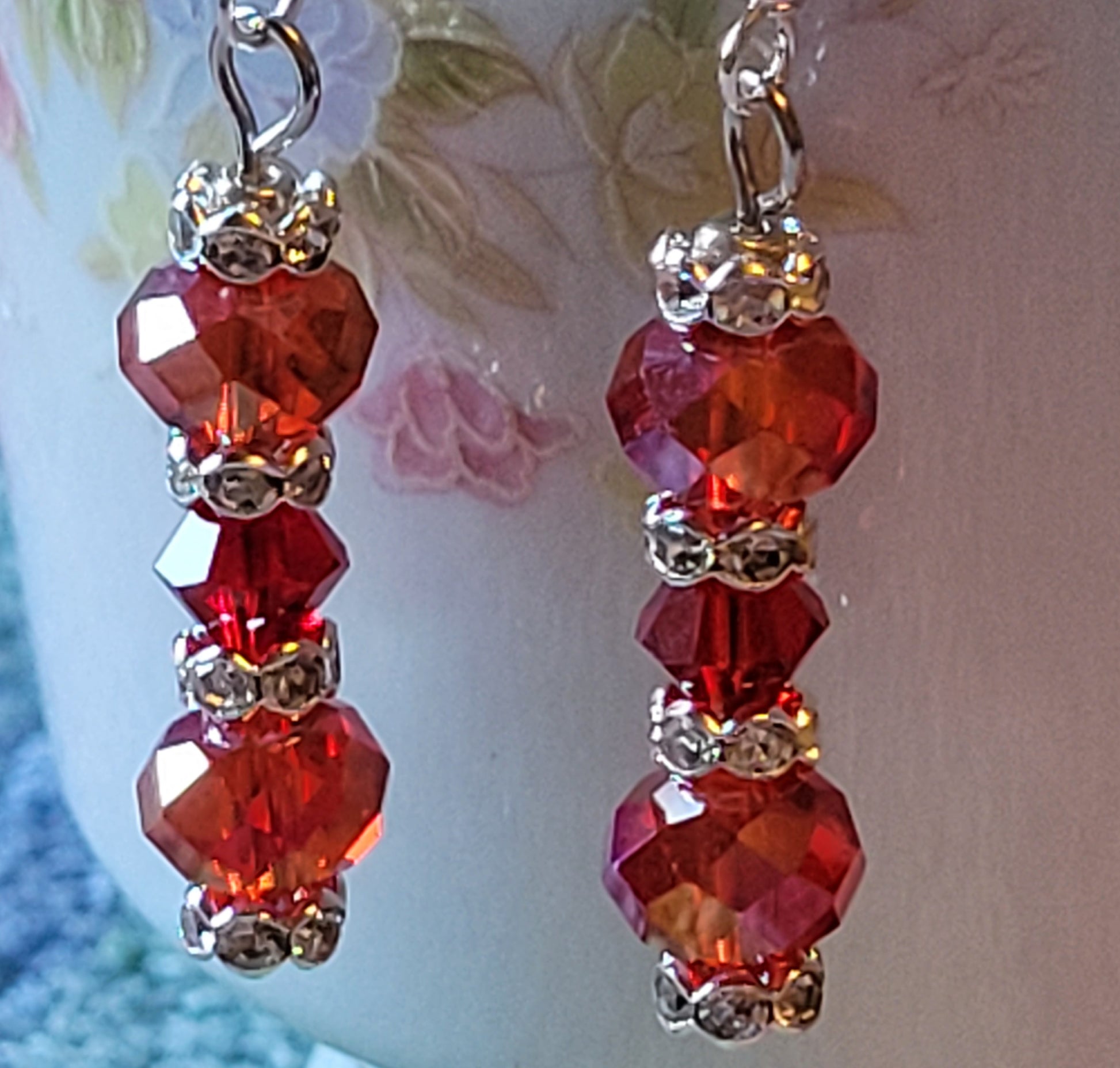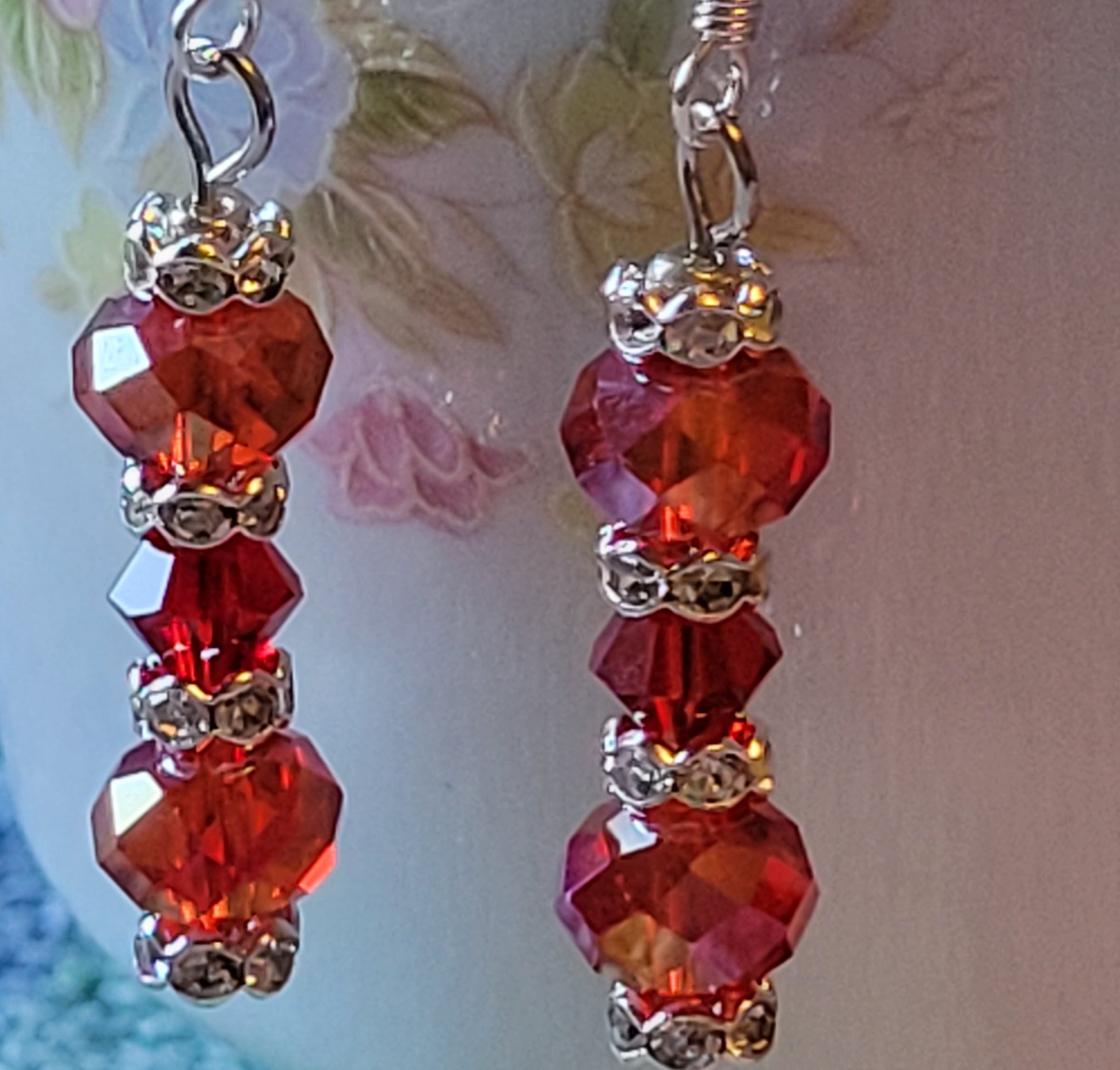 Artisan Elegant RED Crystal Dangle Drop Silver Earrings French Wire