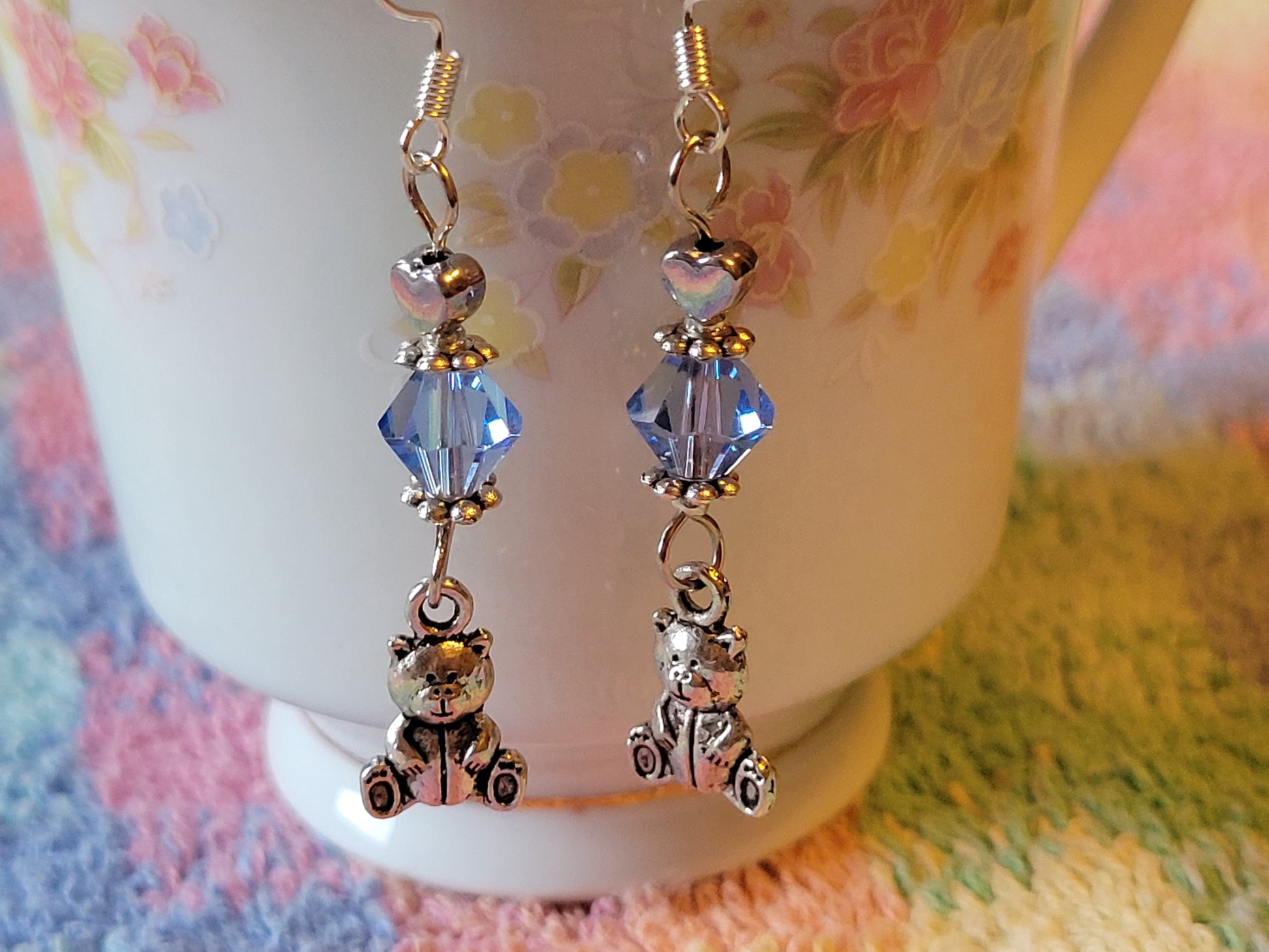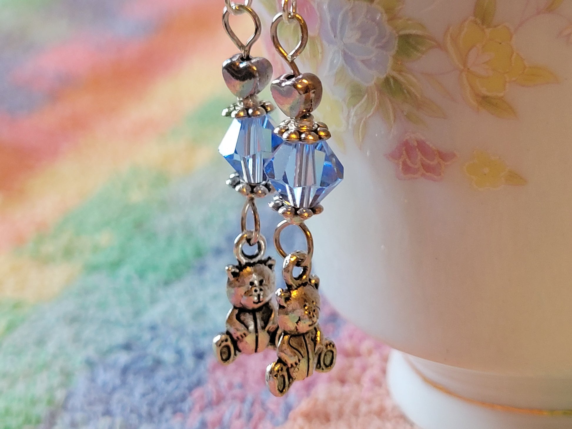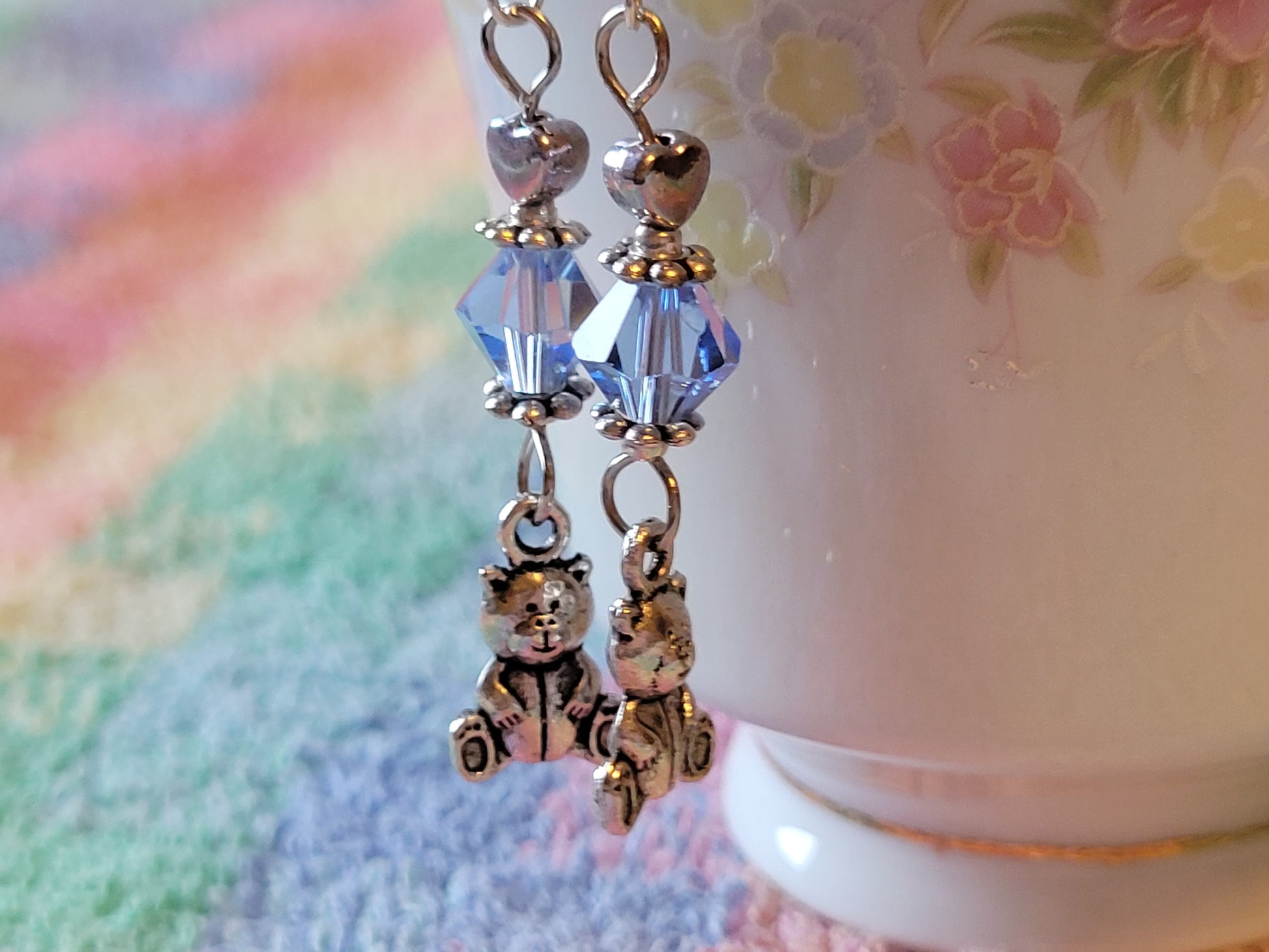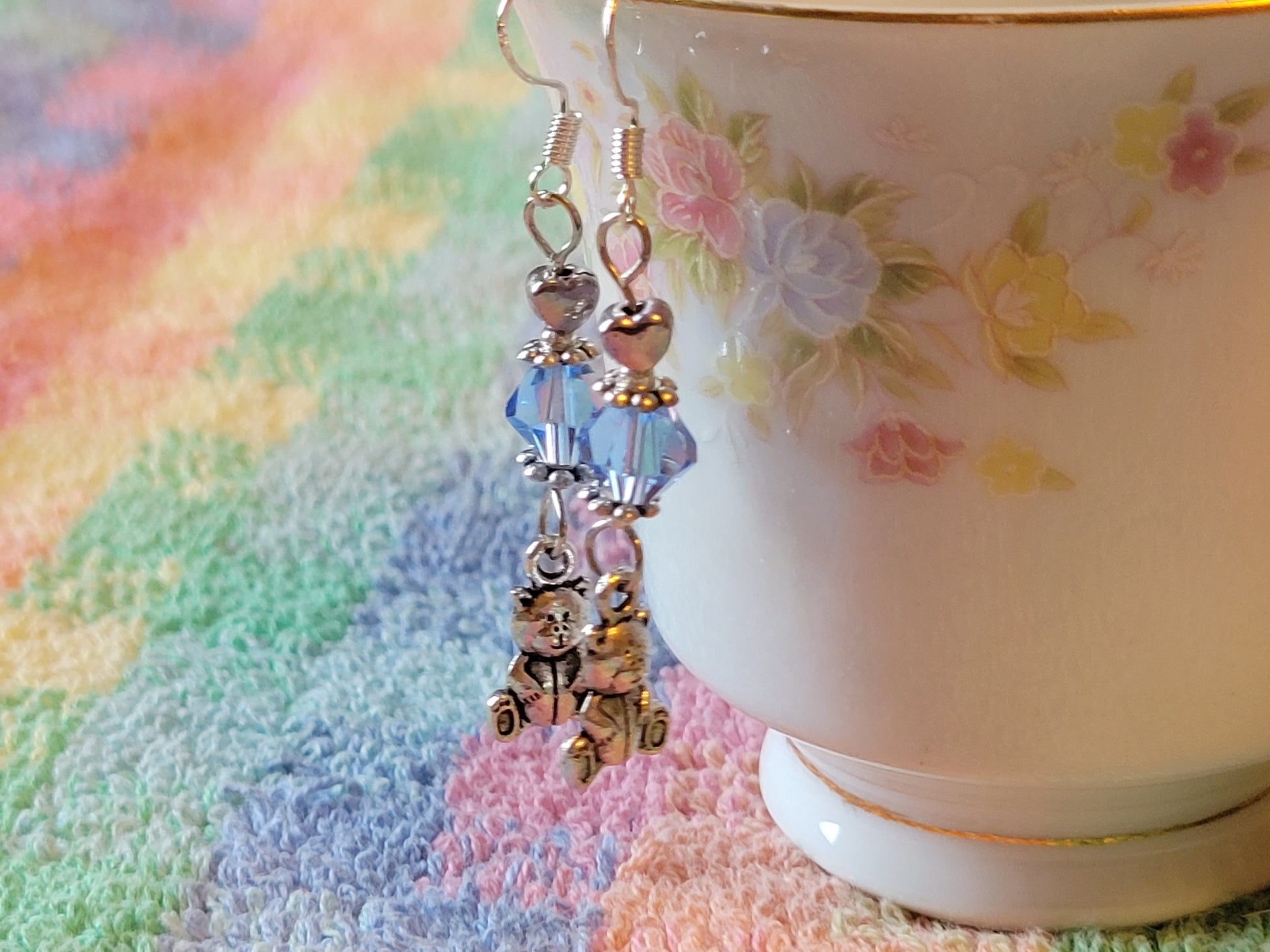 TEDDY BEAR 🐻 Light BLUE Crystal Dangle Drop Silver Tone Pierced Fashion Earrings French Wires