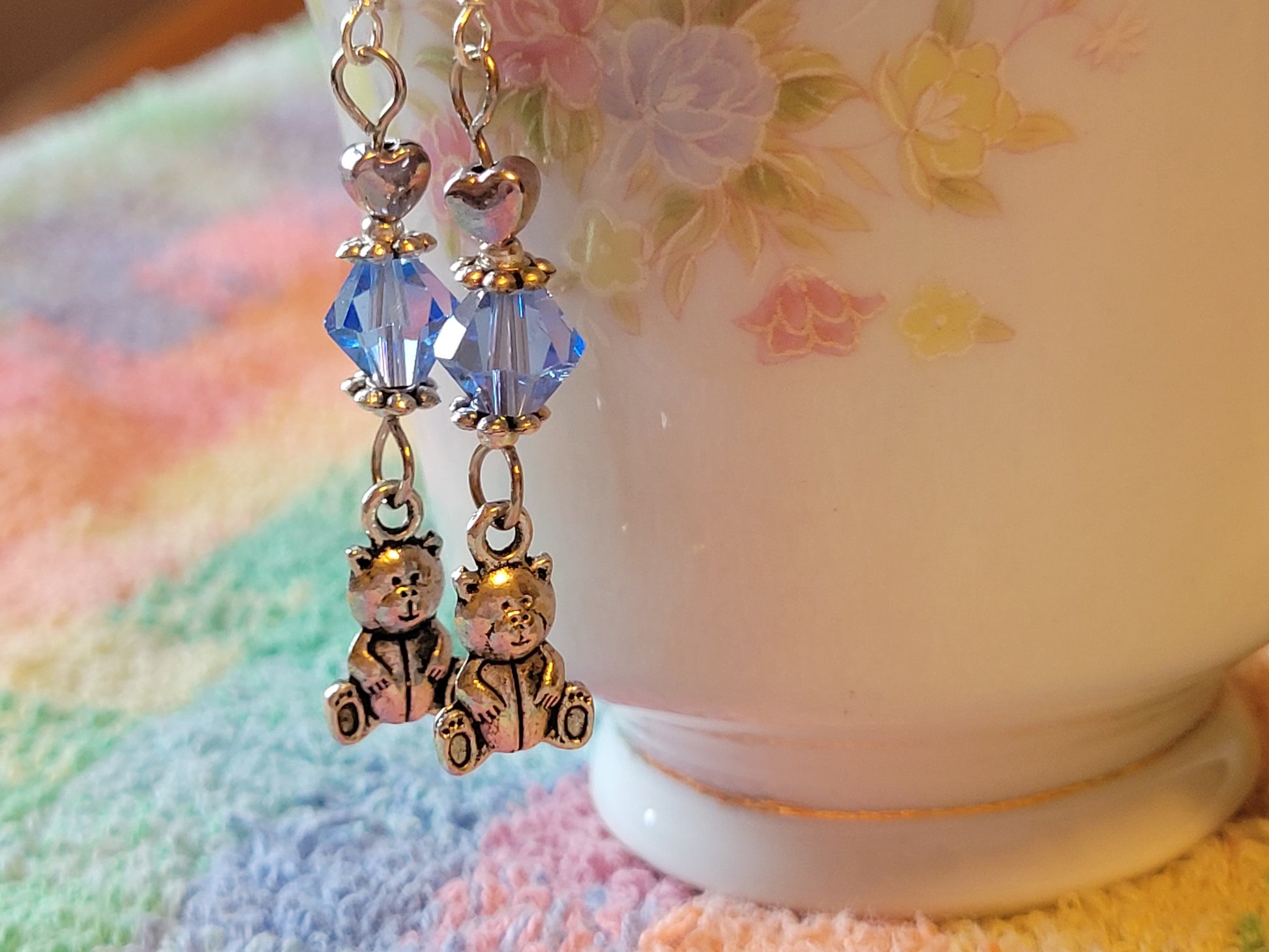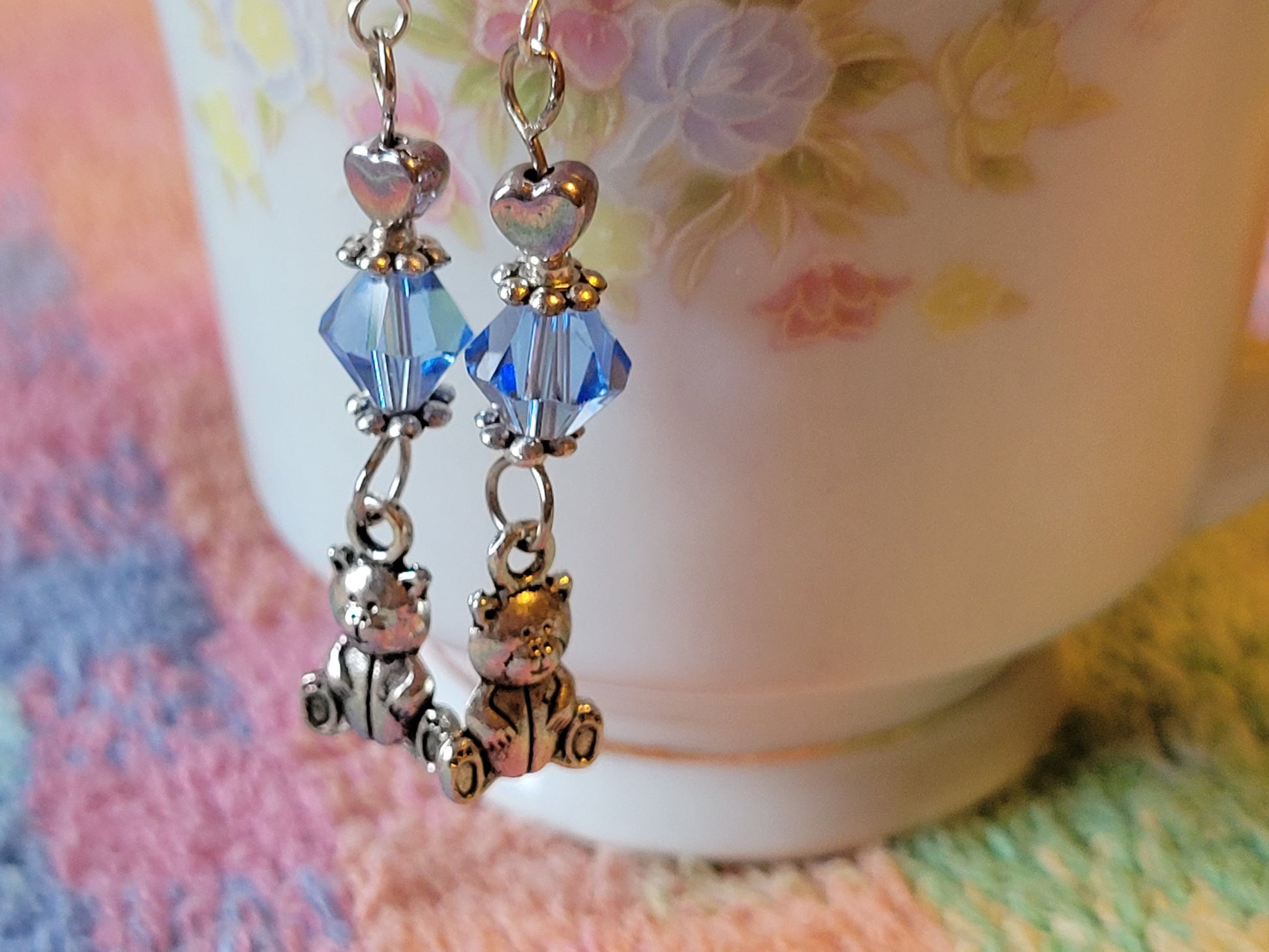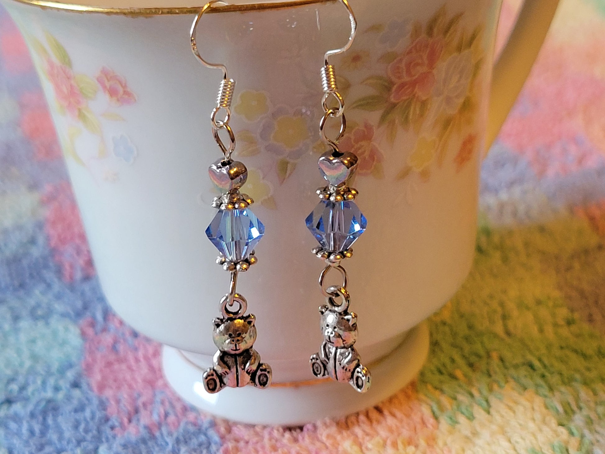 TEDDY BEAR 🐻 Light BLUE Crystal Dangle Drop Silver Tone Pierced Fashion Earrings French Wires