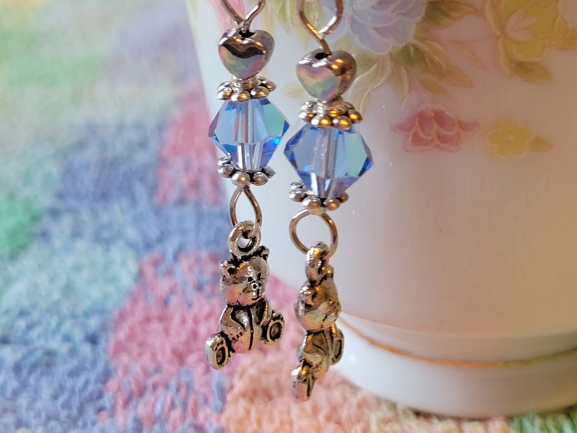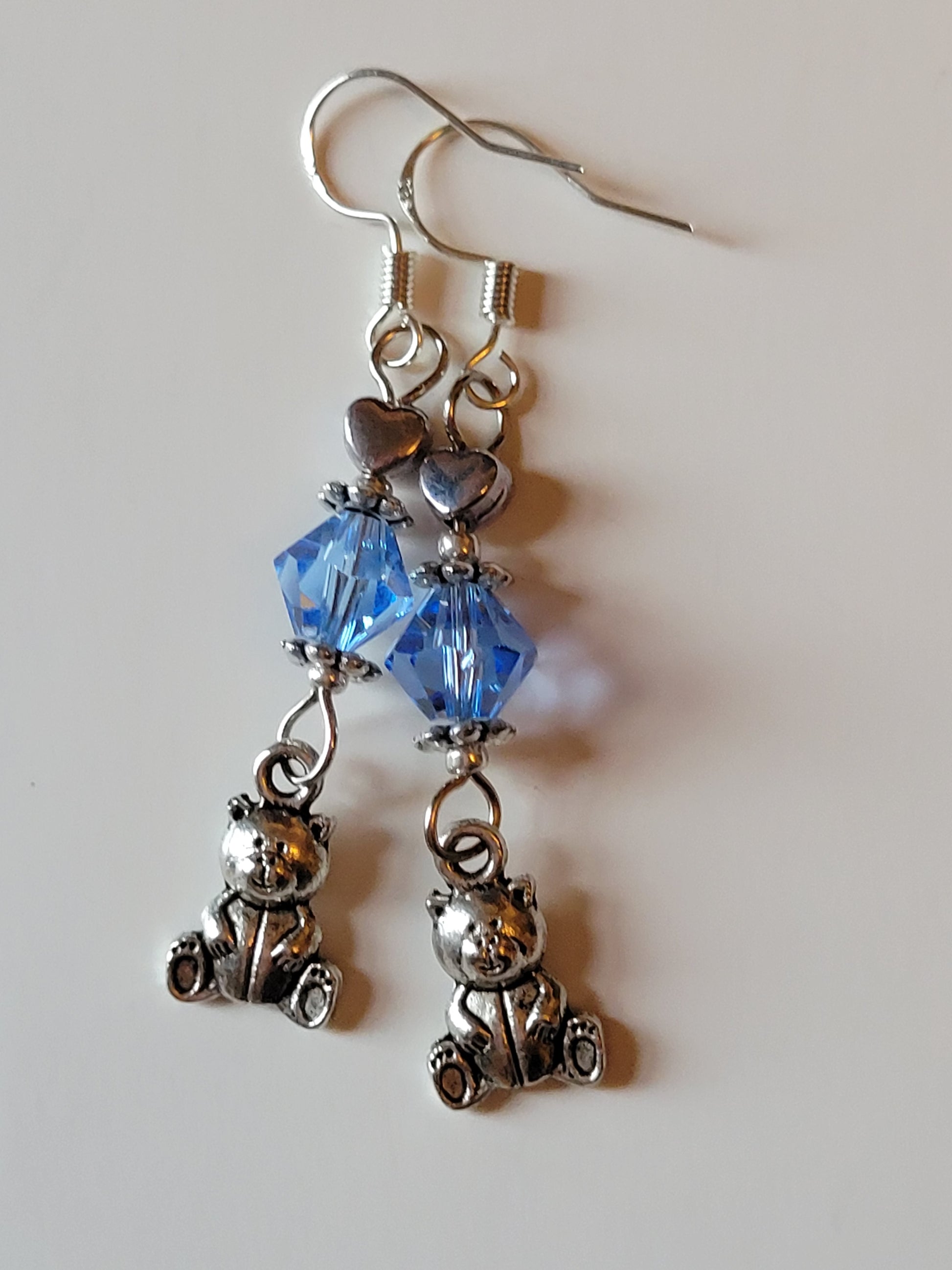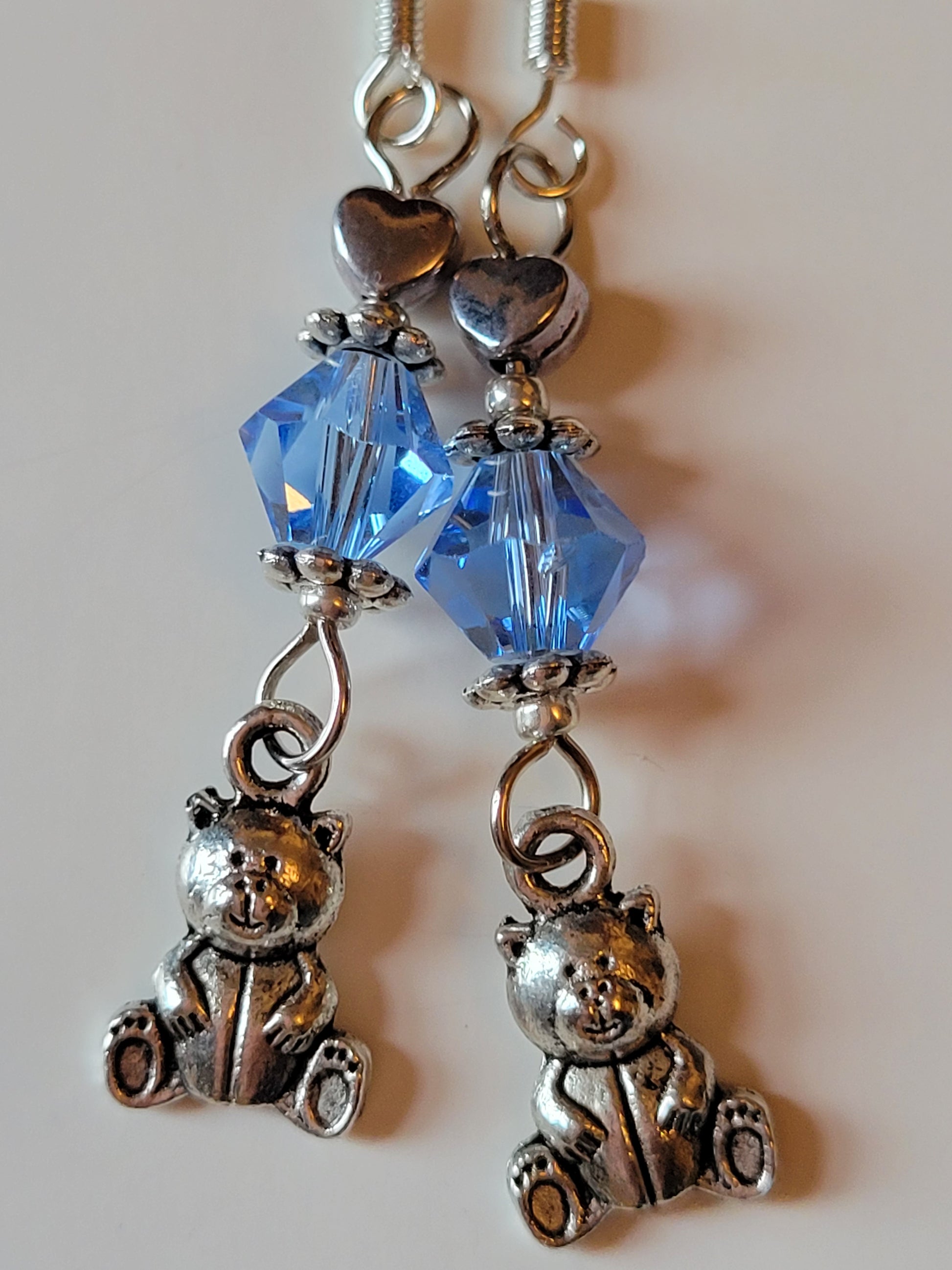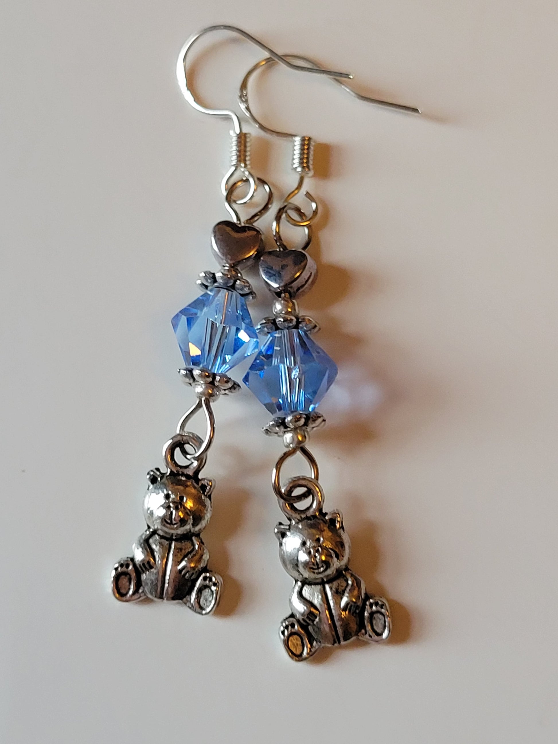 TEDDY BEAR 🐻 Light BLUE Crystal Dangle Drop Silver Tone Pierced Fashion Earrings French Wires