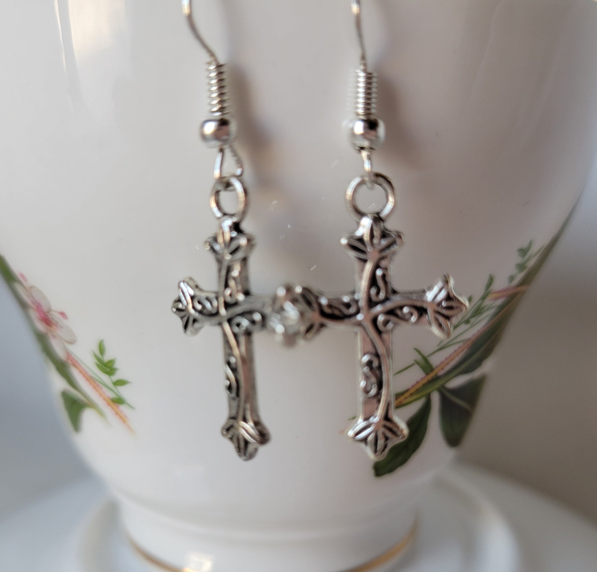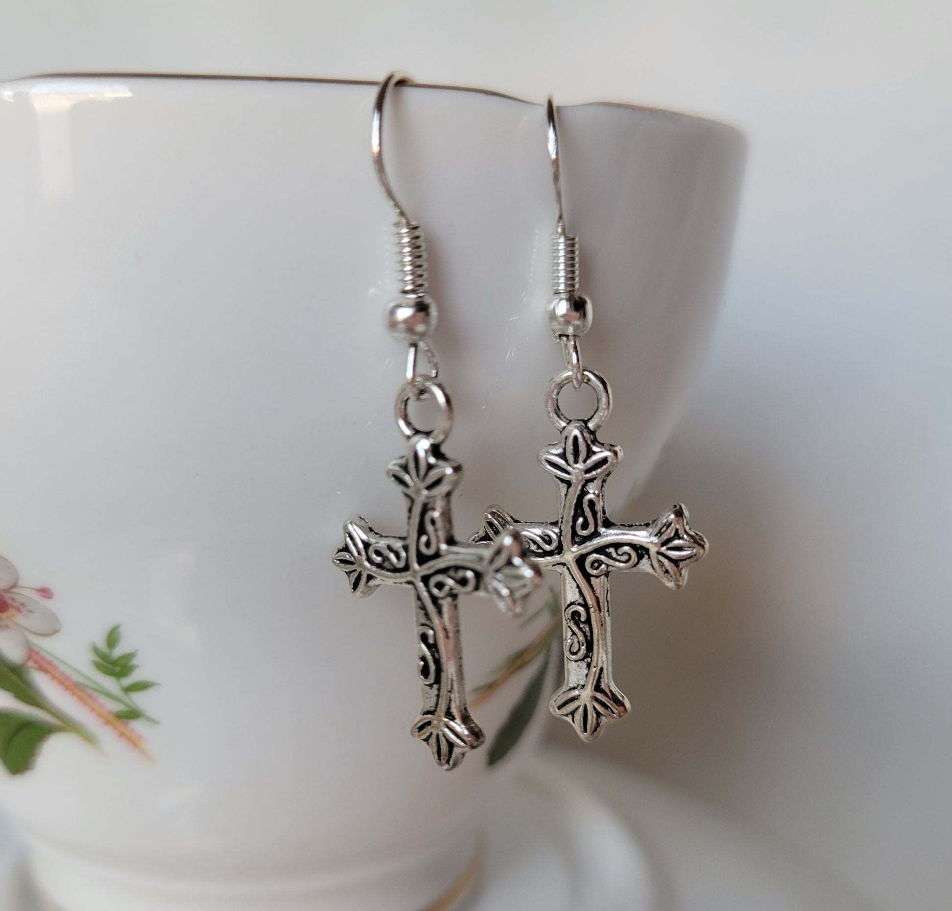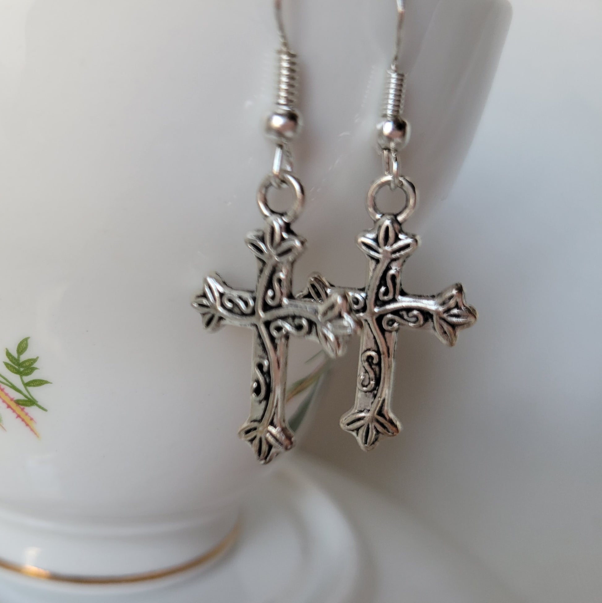 Cross Decorative Dangle Drop Pierced Earrings Tibetan Silver