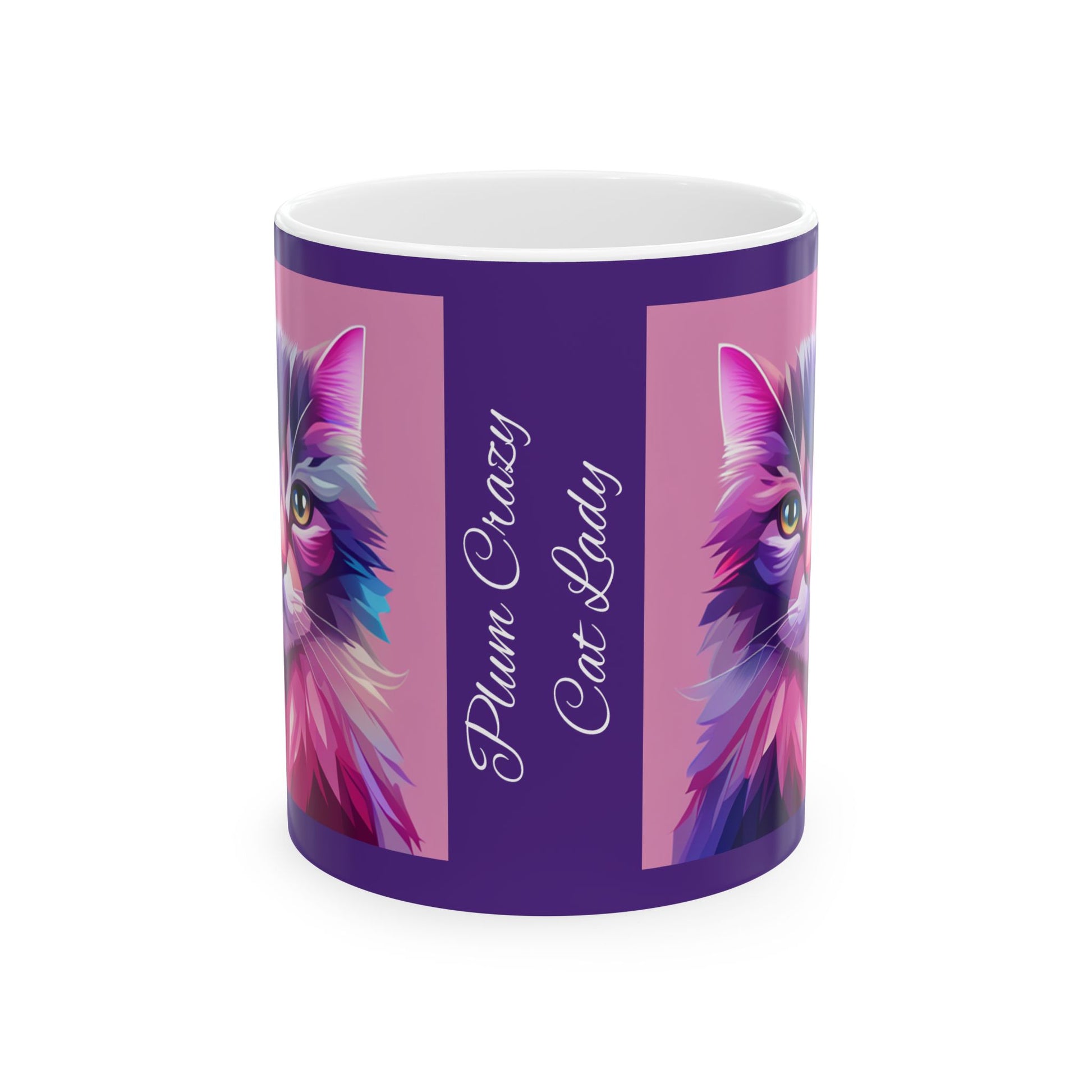 Warm-up with a nice cuppa out of this customized ceramic Plum Crazy Cat Lady coffee mug.