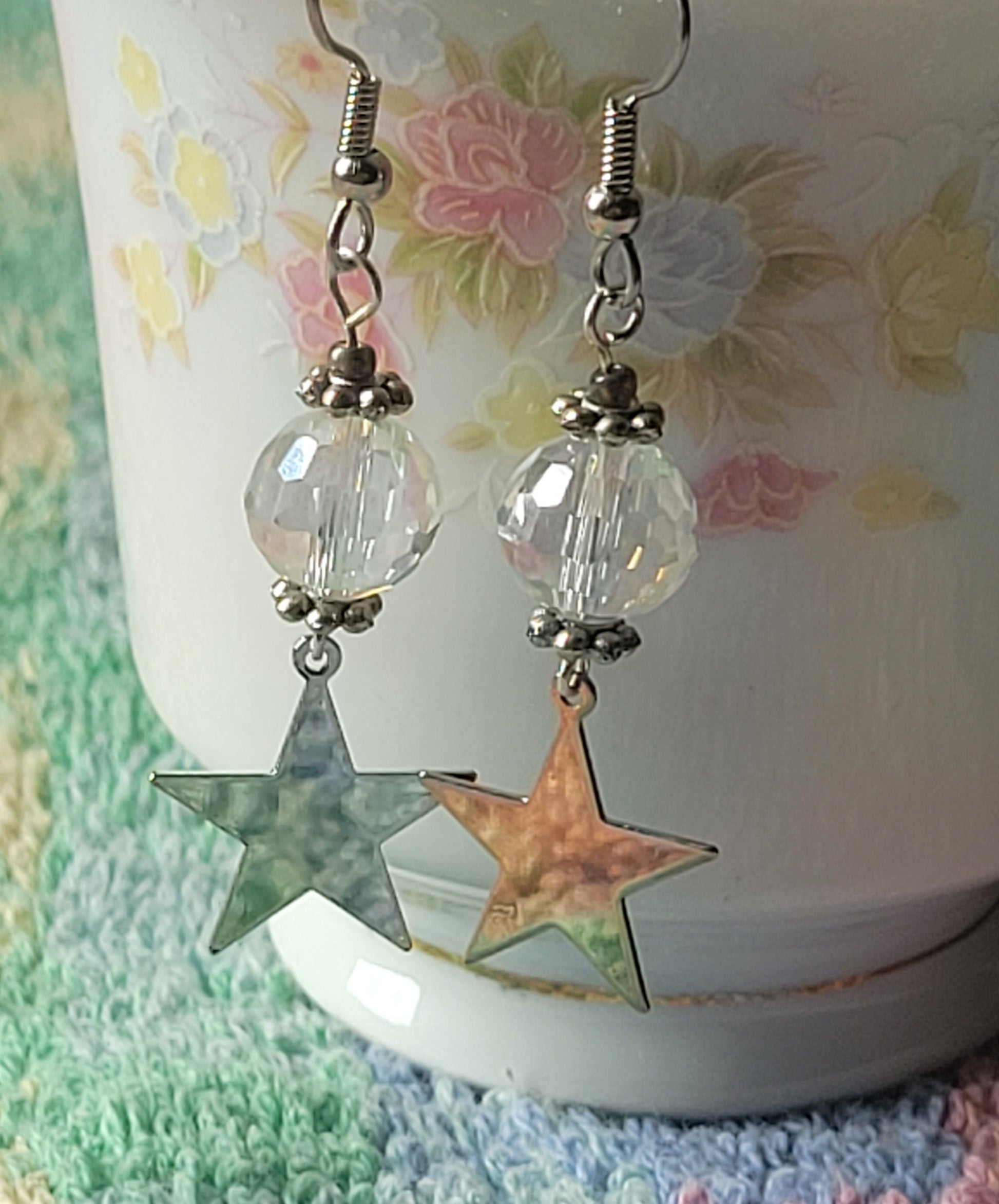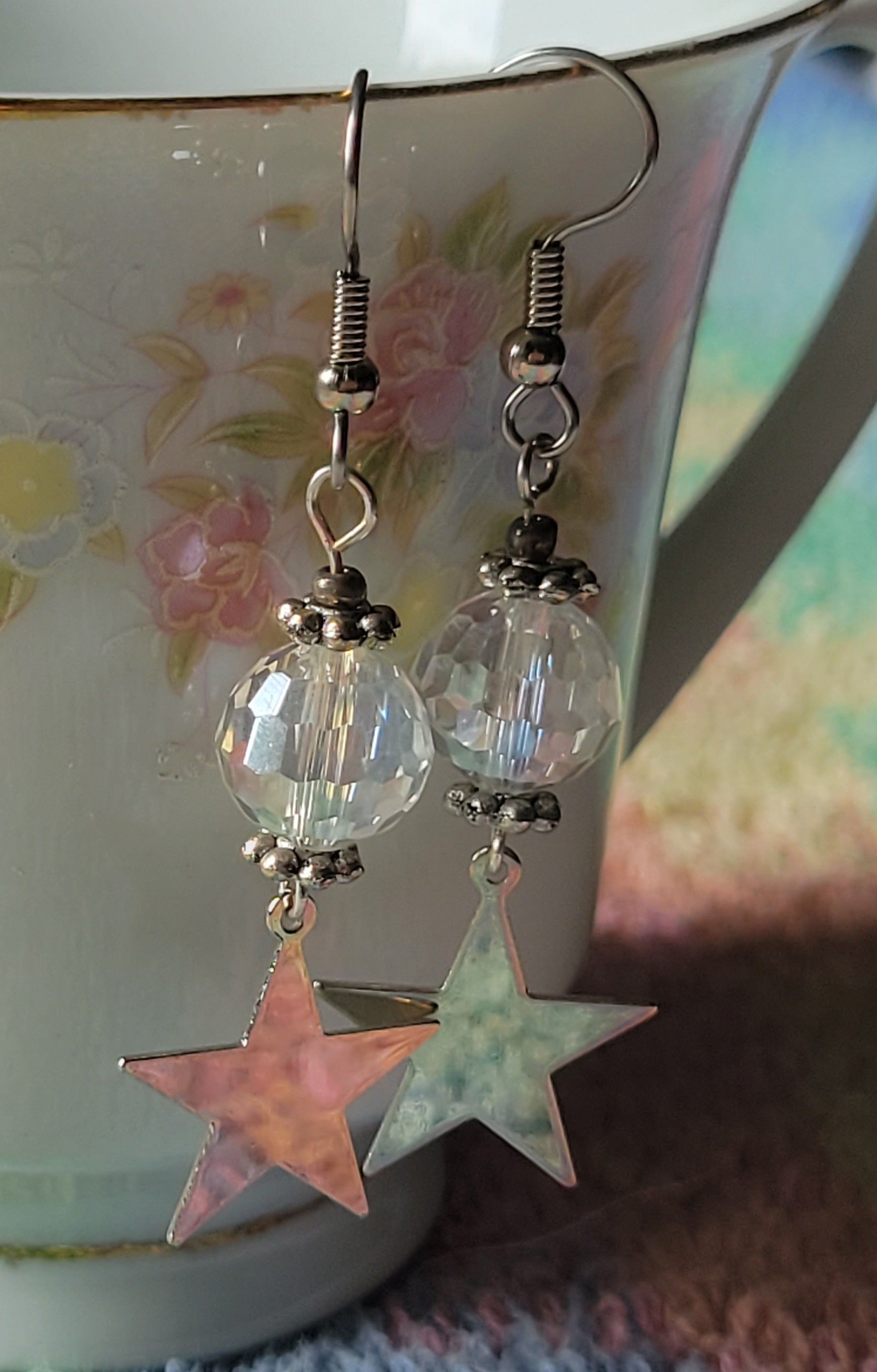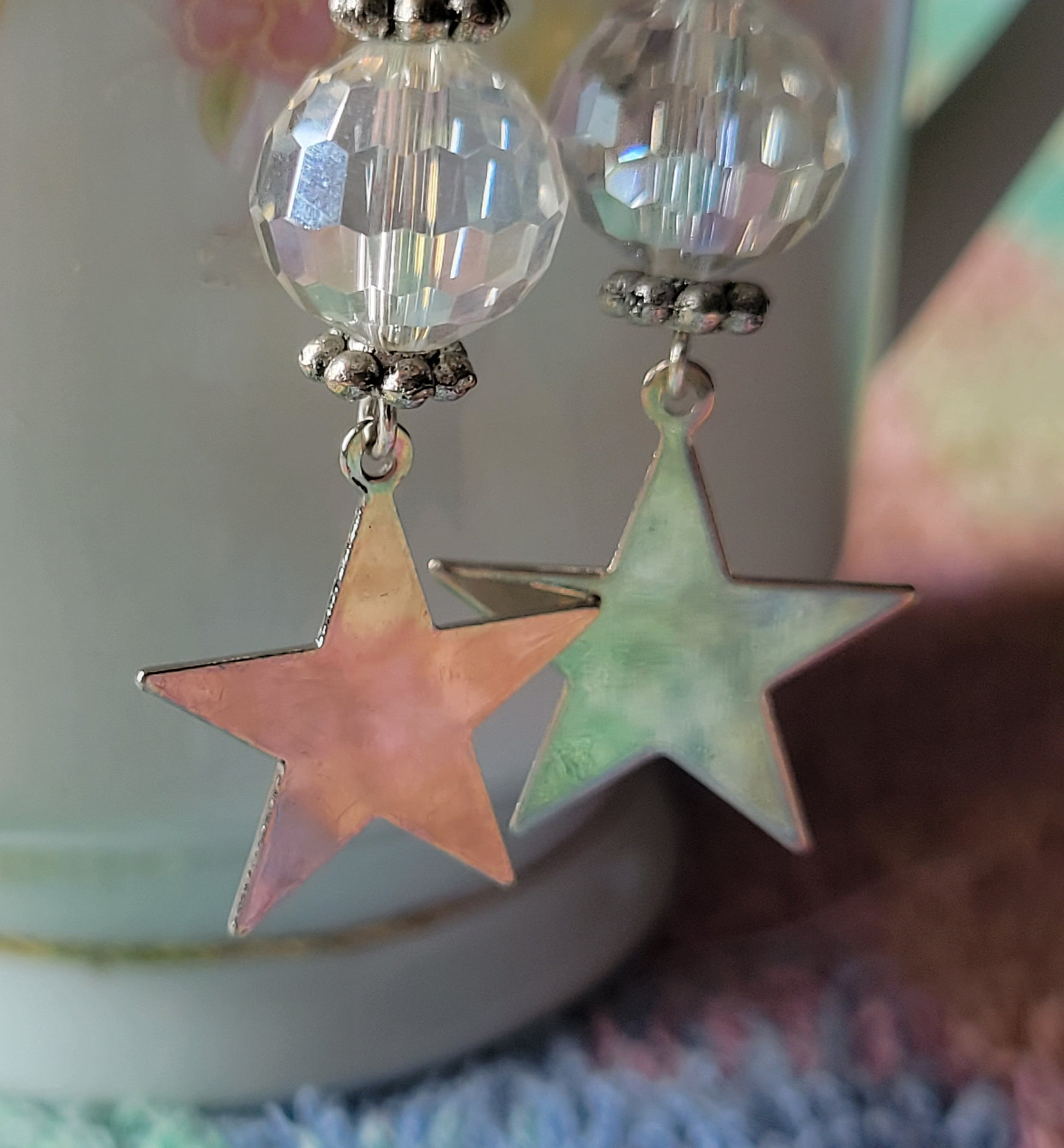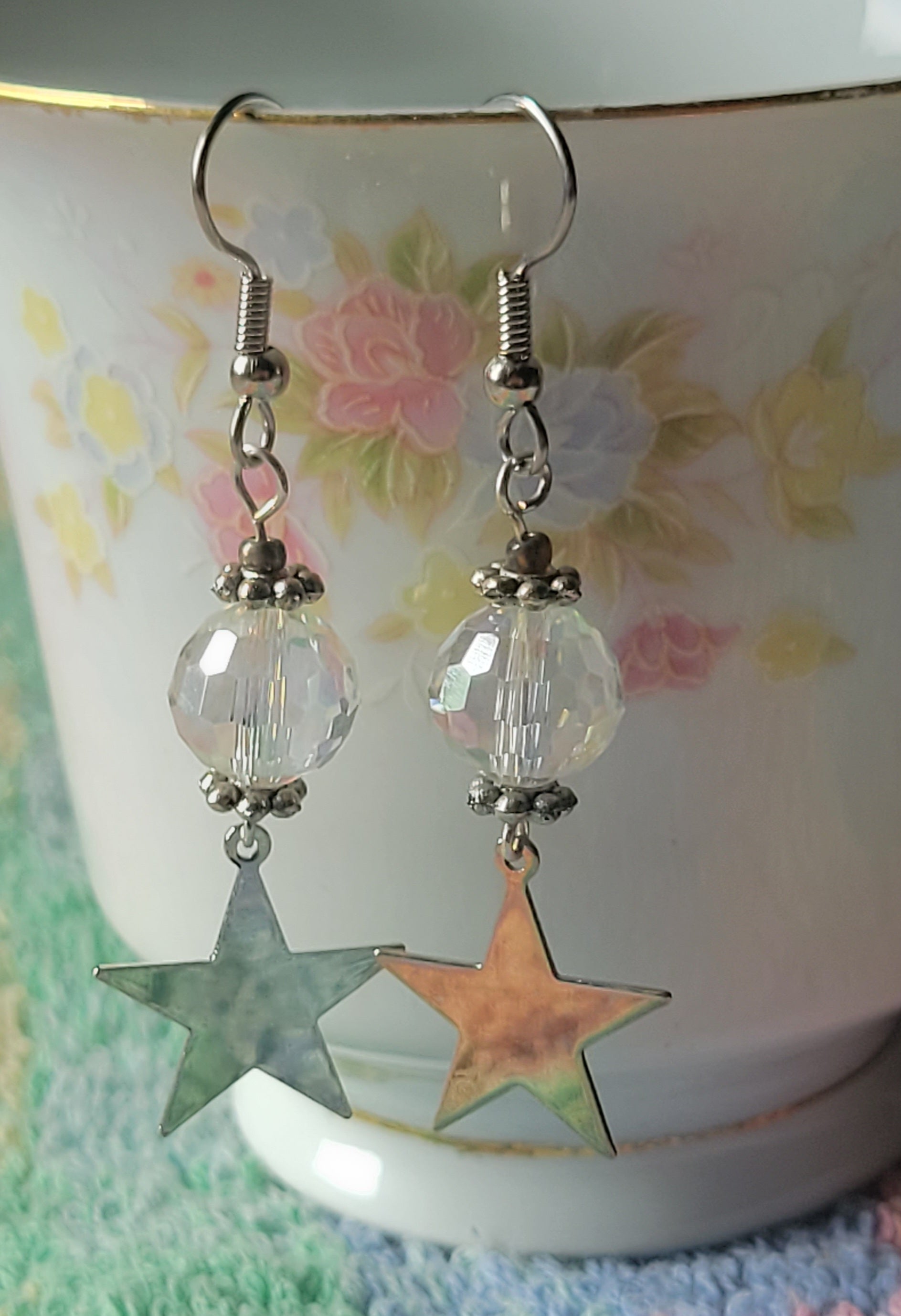 Silver STAR Clear CRYSTAL Long Dangle Drop Pierced Silvertone Fashion Earrings
