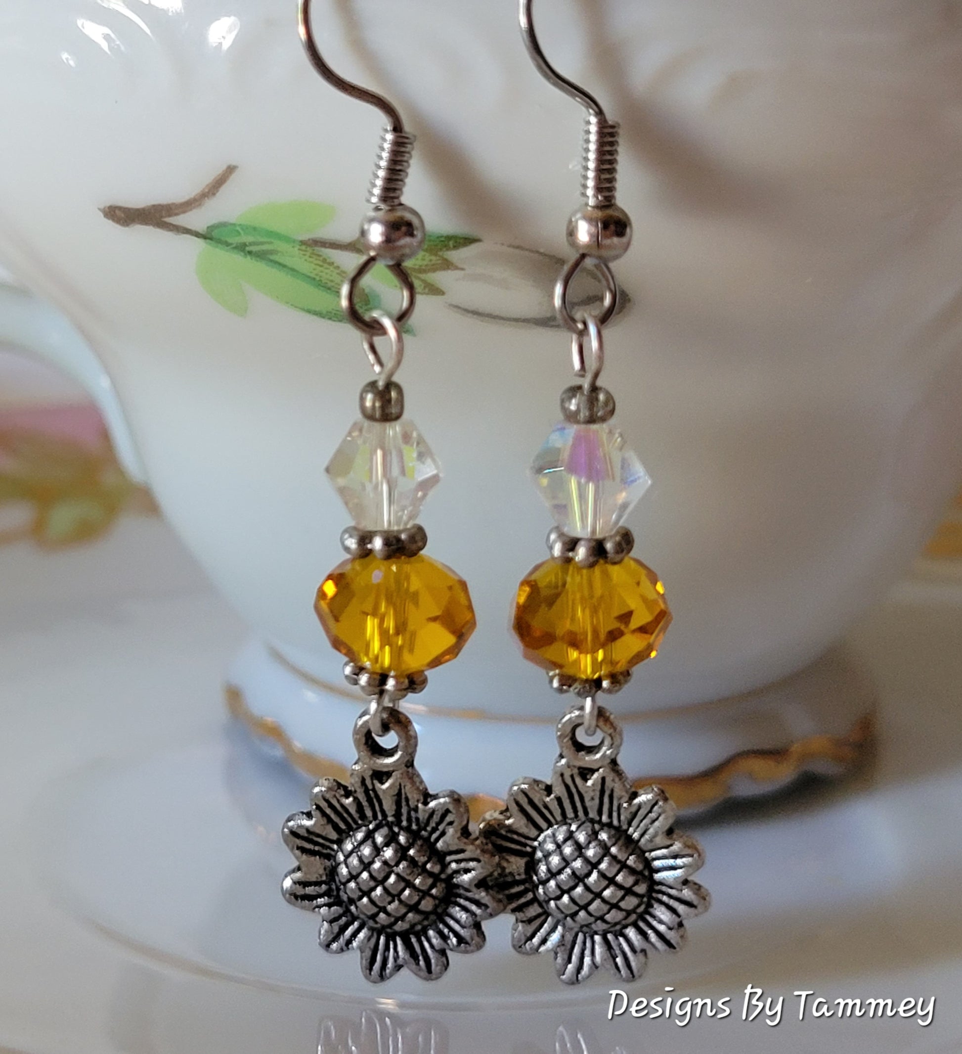 Sunflower 🌻 Crystal Handmade Long Dangle Earrings OOAK Hand Designed