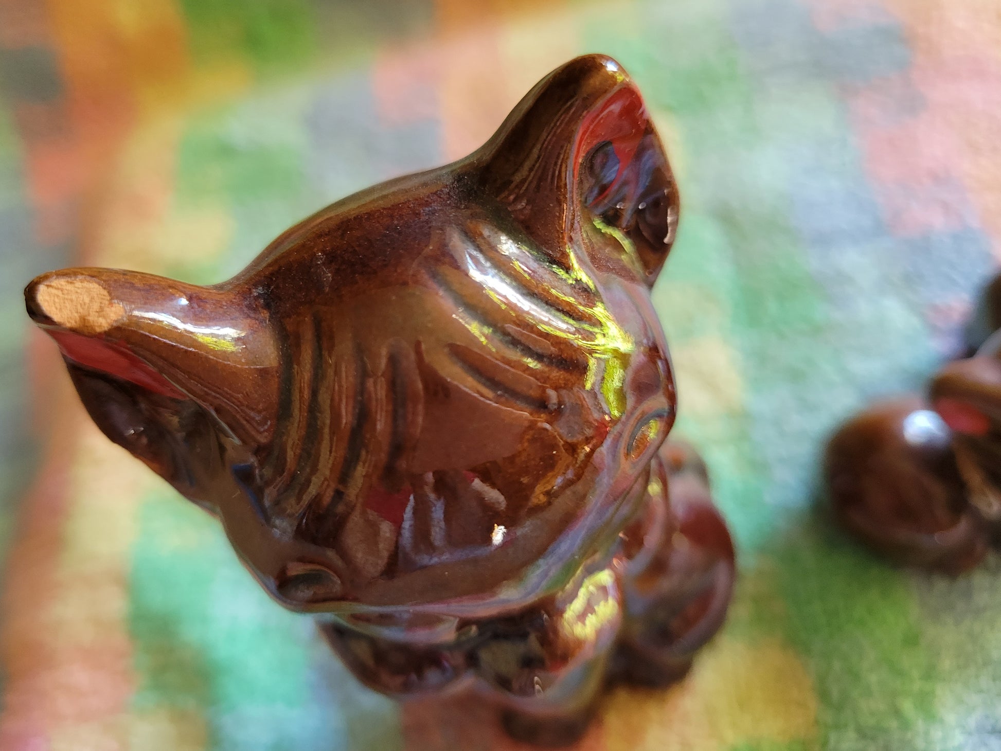 Please see all photos. There are two spots that is like the glaze chipped off. One on a small pig and one on the ear of the large pig.